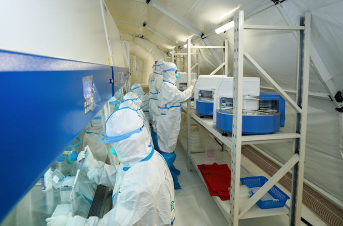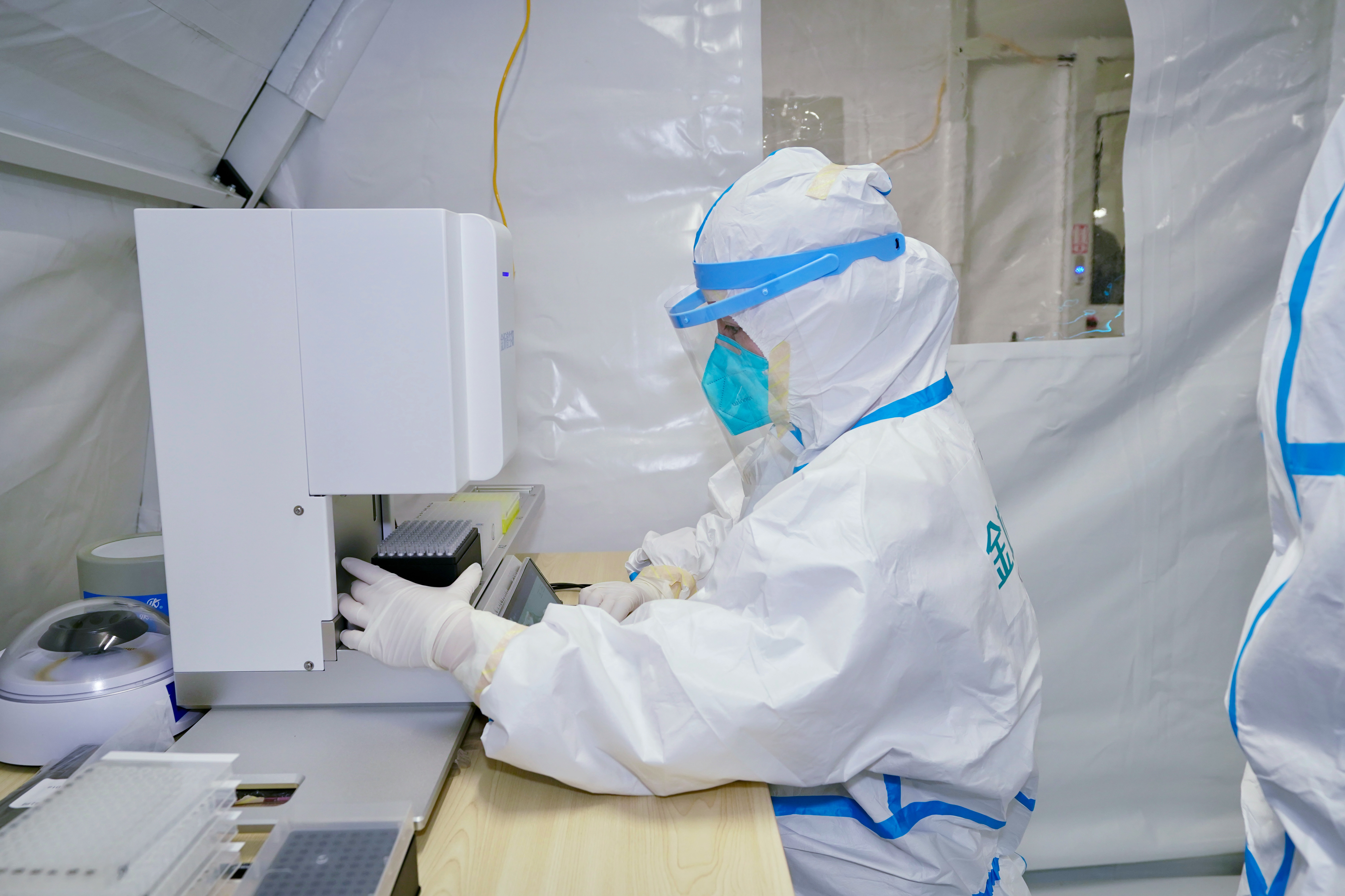 检测人员开展检测工作“猎鹰号”硬气膜实验室投用后,配合此前的实验室,金域医学在港日检测能力提升到20万人份(管),能为即将到来的全民强制核酸检测储备好检测产能,帮助香港尽快遏制疫情扩散。