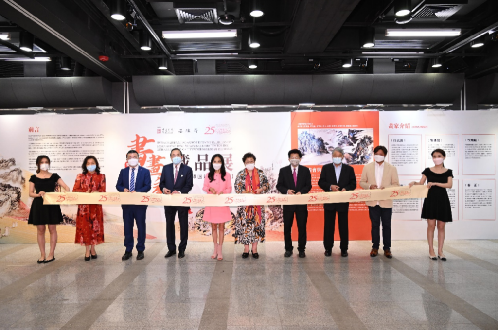 剪彩嘉宾(从左到右分别是:卢碧瑜、伍焕杰、林海涵、罗台秦、吴肖梅、李宏、余仁德、刘凯杰)莅临是次展览开幕式的主礼嘉宾包括:林海涵会计师行的创办人及董事董事林海涵博士、紫荆杂志社社长杨勇、香港书画文玩协会副会长黄湘詅、培侨中学校长伍焕杰、国际华商协进会会长罗台秦博士、卢碧瑜钢琴艺术中心校长卢碧瑜博士、骊山公司顾问柳公权范宽艺术促进会会长李宏、书法家余仁德、亨达集团董事吴肖梅及亨达集团首席执行官刘凯杰等。