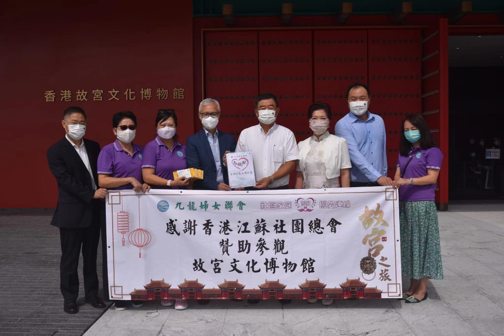 香港故宫文化博物馆展示九百多件来自故宫博物院的珍贵文物,不少都是首次于香港公开展出。香港江苏社团总会作为社区家庭关爱连线的参与团体之一, 江苏总会姚茂龙会长还亲临故宫博物馆自出席赞助仪式,表示此次赞助,可令基层家庭有机会近距离欣赏逾900件无价瑰宝,扩阔视野之外;更是希望能够令基层家庭的小朋友通过亲眼目睹珍贵的文物,对中国文化艺术和悠久的历史的有进一步认识,感悟中华文化的博大精深,以及中华民族的智慧,籍此增强民族自豪感及对国家的归属感,此举更能为继承中华优秀传统文化出一份绵薄之力。
