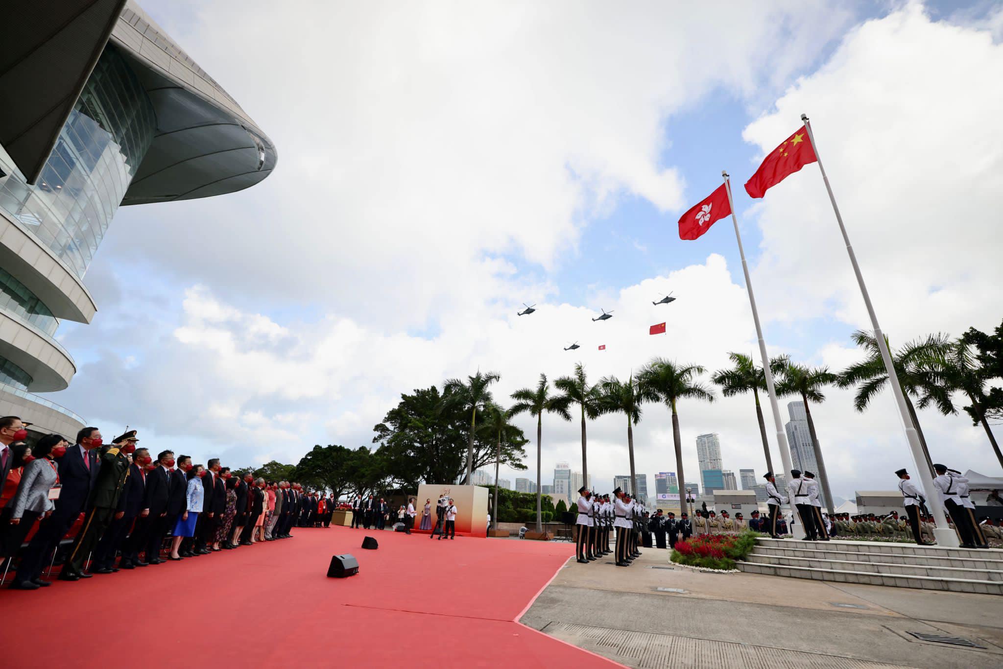 护旗方队进场后,国旗及区旗升上旗杆顶,飞行服务队两架直升机分别悬挂国旗及区旗,飞越维港上空,消防轮及水警轮则在会展对开海面敬礼。