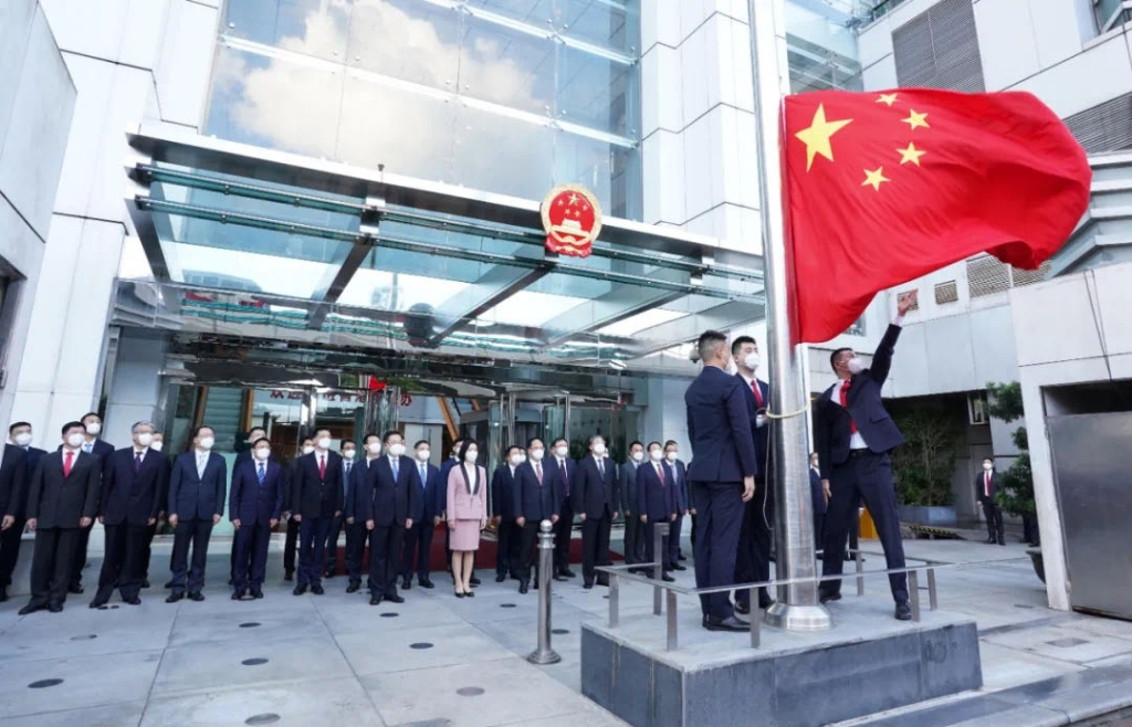 早上7时,香港中联办举行升旗仪式。现场奏唱国歌,升旗手将国旗升起。香港中联办副主任陈冬、卢新宁、罗永纲、何靖、尹宗华等出席。