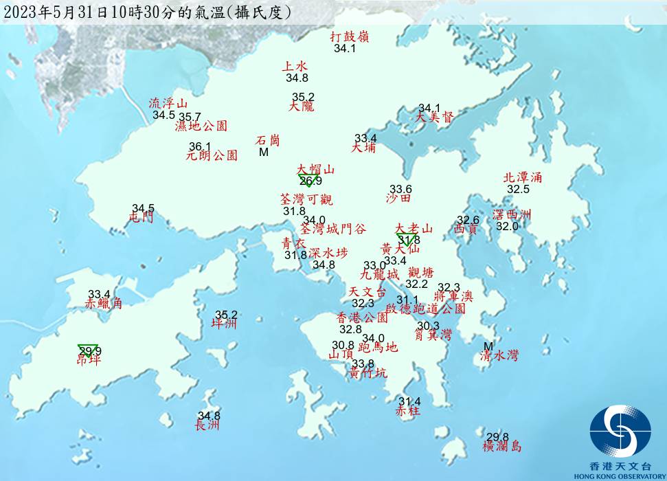 根据天文台分区天气报告,早上10时30分,本港多区气温高达34度或以上,当中上水录34.8度、流浮山34.5度、湿地公园35.7度、元朗公园高达36.1度。