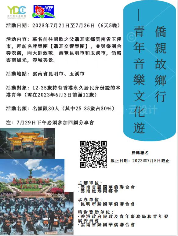 紫荆杂志(记者肖扬)7月11日昆明报道:日前,记者从云南旅港同乡会获悉,为庆祝香港回归26周年,增进香港青年积极融入国家发展,传承中华传统文化,弘扬文化自信,促进两地文化交流,由云南省侨联、昆明市侨联、云南旅港同乡会等香港社会团组织以《侨亲故乡行——青年音乐文化游》为主题30人青年参访团,将于7月21日至26日在昆明出席第七届聂耳音乐周参演和交流,并与昆明聂耳交响乐团在昆共同举办两场合作演出。
