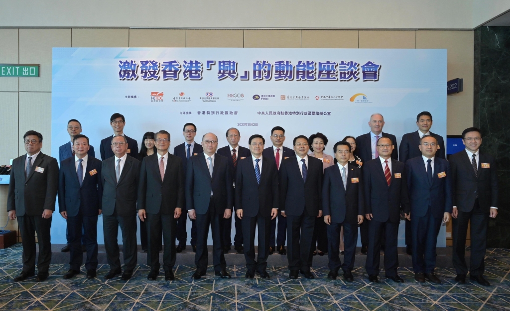 座谈会现场(图片来源:中央政府驻港联络办)行政长官李家超、中联办主任郑雁雄、财政司司长陈茂波、商务及经济发展局局长邱应桦、财经事务及库务局局长许正宇、创新科技及工业局局长孙东、广东省发改委副主任朱伟以及来自工商界的代表共同出席会议,总结一年来香港商界在增强发展动能方面所做的工作,展现香港经济全面持续向好的新局面,同时围绕香港如何进一步激发“兴”的动能展开讨论。