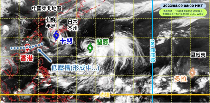 天文台昨日发表天气随笔并指出,香港风季已经开锣,继上月两个热带气旋“泰利”和“杜苏芮”,西北太平洋在八月份依然是“热闹”,目前共有三个台风。当中,“卡努”预料将于今日(11日)登陆朝鲜半岛,随后进入中国东北地区,预料当地会有另一波强降雨,为当地防汛工作带来挑战。台风“兰恩”则预料会在未来数日,移向日本本州以南海域。至于位于中太平洋的四级飓风“多拉”(Dora),预料将于明日(12日)进入北太平洋西部。