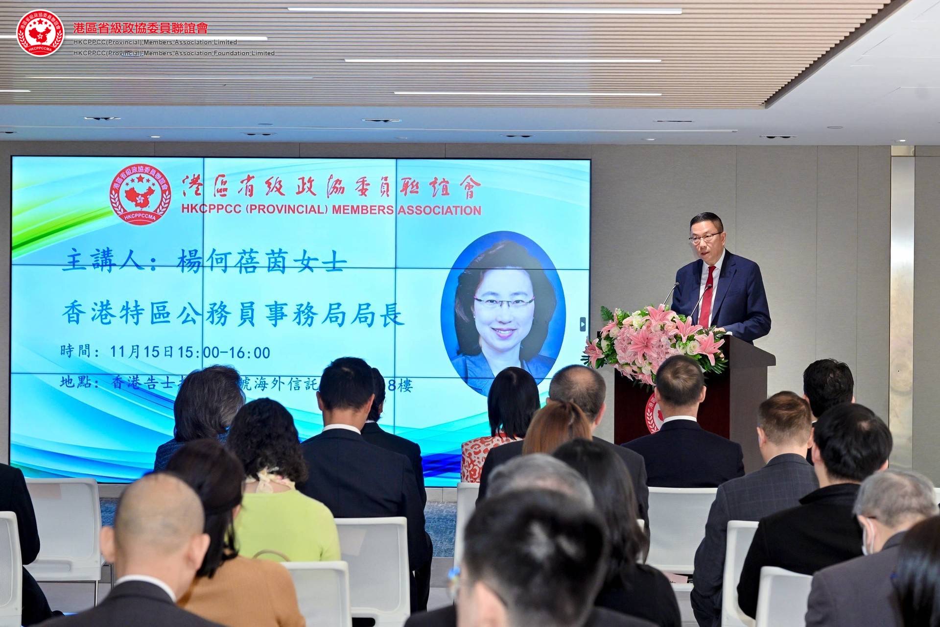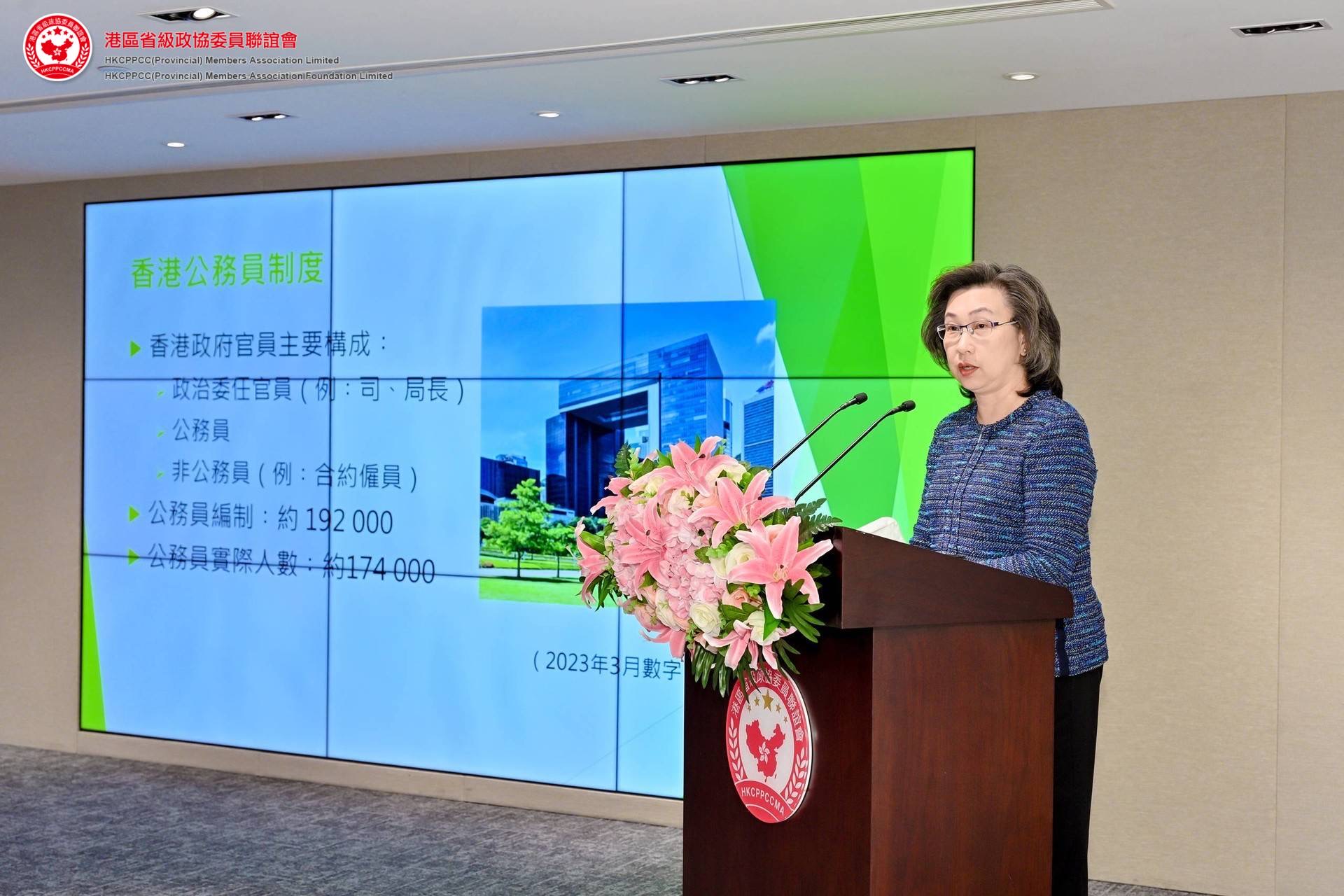 15日下午,香港特别行政区公务员事务局局长杨何蓓茵应邀到访港区省级政协委员联谊会,与港省联70余位成员进行现场交流。杨何蓓茵局长系统地介绍公队员队伍和团队建设情况,并逐一针对坊间对公务员的既定印象进行解说,以破除迷思。