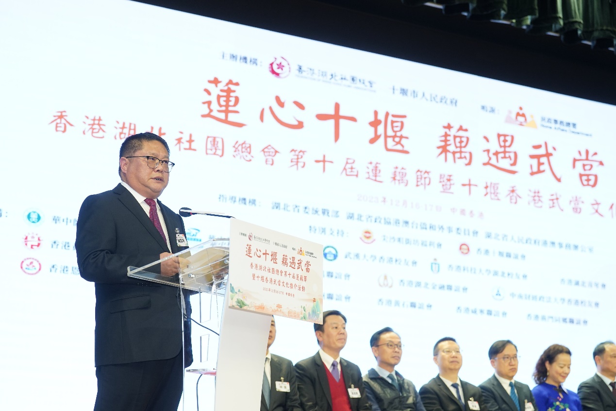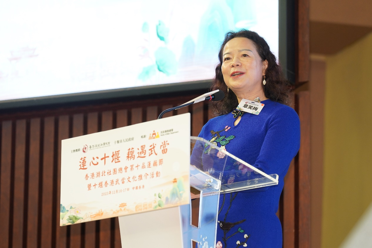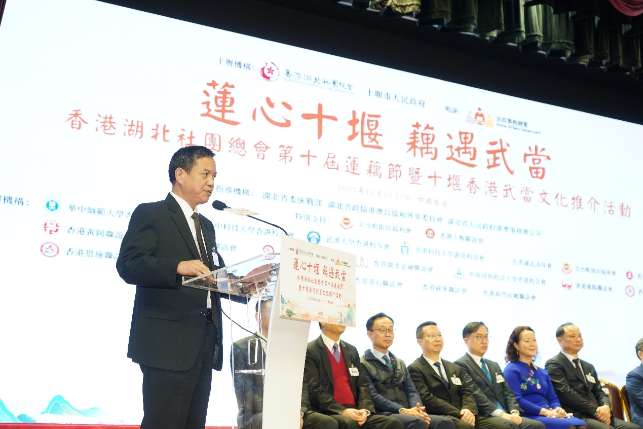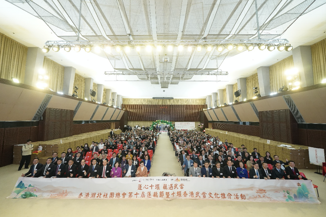 “莲心十堰·藕遇武当”香港湖北社团总会第十届莲藕节暨十堰香港武当文化推介活动于12月16日下午在尖沙咀街坊福利会会堂隆重开幕。香港特别行政区第五任行政长官林郑月娥,中央政府驻港联络办社团联络部部长钟吉昌,研究部副部长张军,湖北省委统战部常务副部长陈亮,湖北省人民政府港澳办主任章笑梅,香港特别行政区政府民政事务总署署长张赵凯渝,湖北省十堰市政协副主席赵国平,香港特别行政区政府劳工处副处长冯浩贤,全国人大代表、工联会会长吴秋北,全国政协委员、香港江西社团(联谊)总会主席王再兴,香港大学客席教授、香港中文大学荣誉教授聂德权,湖北省委统战部联络处处长易军,湖北省十堰市委统战部常务副部长董飞,全国政协委员、香港湖北社团总会会长谢俊明及总会常务副会长熊汉生、喻鹏、林富强、梁世民,总会顾问、尖沙咀街坊福利会理事长苏仲平等出席活动。