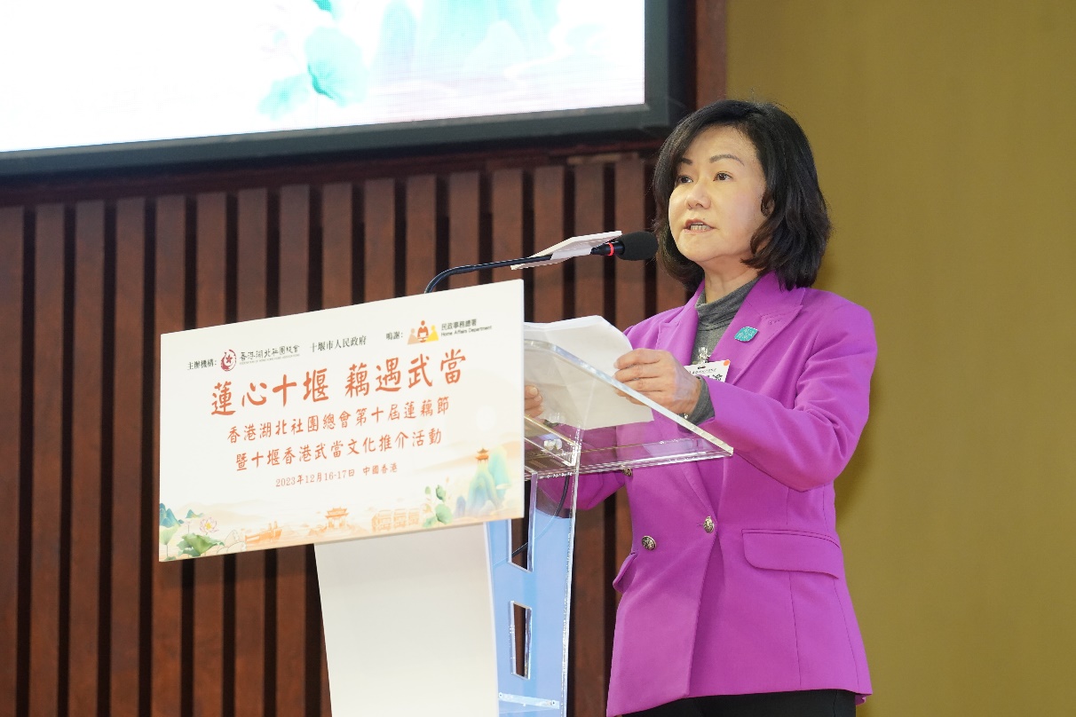 香港特别行政区民政事务总署署长张赵凯渝在致辞中表示,香港湖北社团总会自成立以来,一直坚持支持特区政府依法施政,维护香港繁荣稳定,又不时举办推广家乡文化的活动,例如莲藕节、武昌鱼文化节等等,更多次协调湖北省交流团访问香港,促进粤港两地的合作,共谋发展,融入国家发展的大局,爱国爱港爱乡,建设良多。民政事务总署自2018年起推出了“乡·港连心计划”资助同乡社团举办的各类活动,例如文化艺术表演,社区探访以及内地交流团等等。五年以来,资助了超过100多项活动,不但大大地丰富了市民的生活,也增加了香港人对国家的了解和认同。在来年的第一季,民政事务总署将推出为期三年的同乡文化推广计画,资助同乡社团举办推广家乡文化的活动,加深市民对国家的归属感。