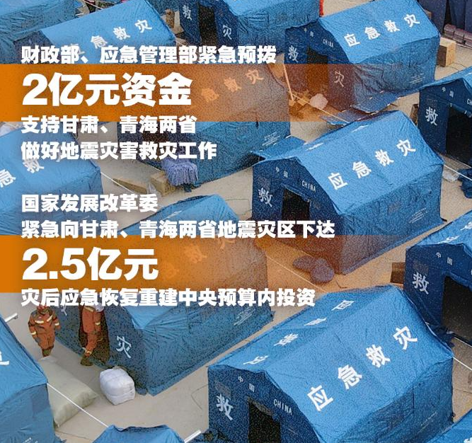 财政部、应急管理部紧急预拨甘肃、青海两省2亿元中央自然灾害救灾资金,支持两省做好地震灾害救灾工作,统筹用于应急抢险和受灾群众救助工作,重点做好搜救转移安置受灾人员、排危除险等应急处置、次生灾害隐患排查和应急整治、倒损民房修复等工作。甘肃省财政厅紧急下拨抗震救灾资金2000万元,帮助灾区妥善安置受灾群众。