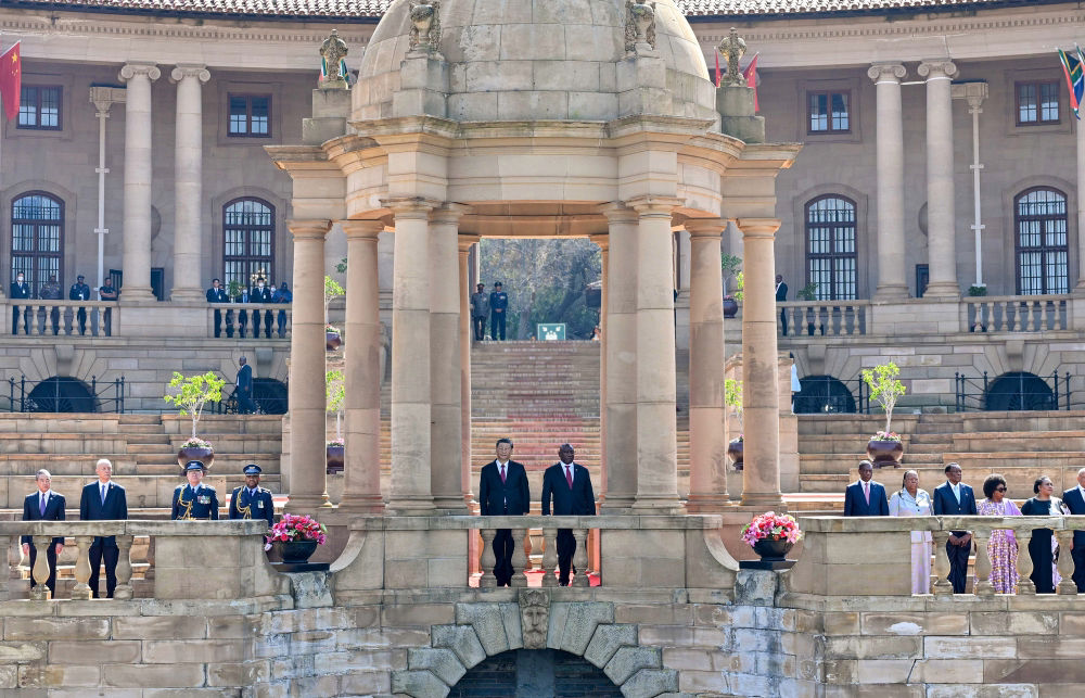 当地时间2023年8月22日上午,正在南非进行国事访问的国家主席习近平在比勒陀利亚总统府同南非总统拉马福萨会谈。会谈前,拉马福萨在总统府广场为习近平举行欢迎仪式。