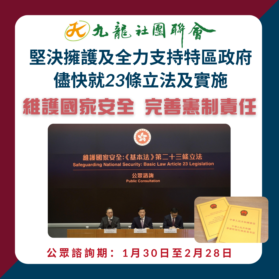 九龙社团联会仝人获悉后倍感振奋及鼓舞。在香港回归第二十七个年头,我们看到了一个真正有执行力的特区政府,看到政府团队坚定维护国家安全,为市民谋幸福,为香港谋发展,敢拼善为的底气与担当。九龙社团联会必坚决拥护特区政府就《基本法》第二十三条立法,全力配合政府团队做好相关咨询工作,展现爱国爱港力量的新担当、新作为、新气象。