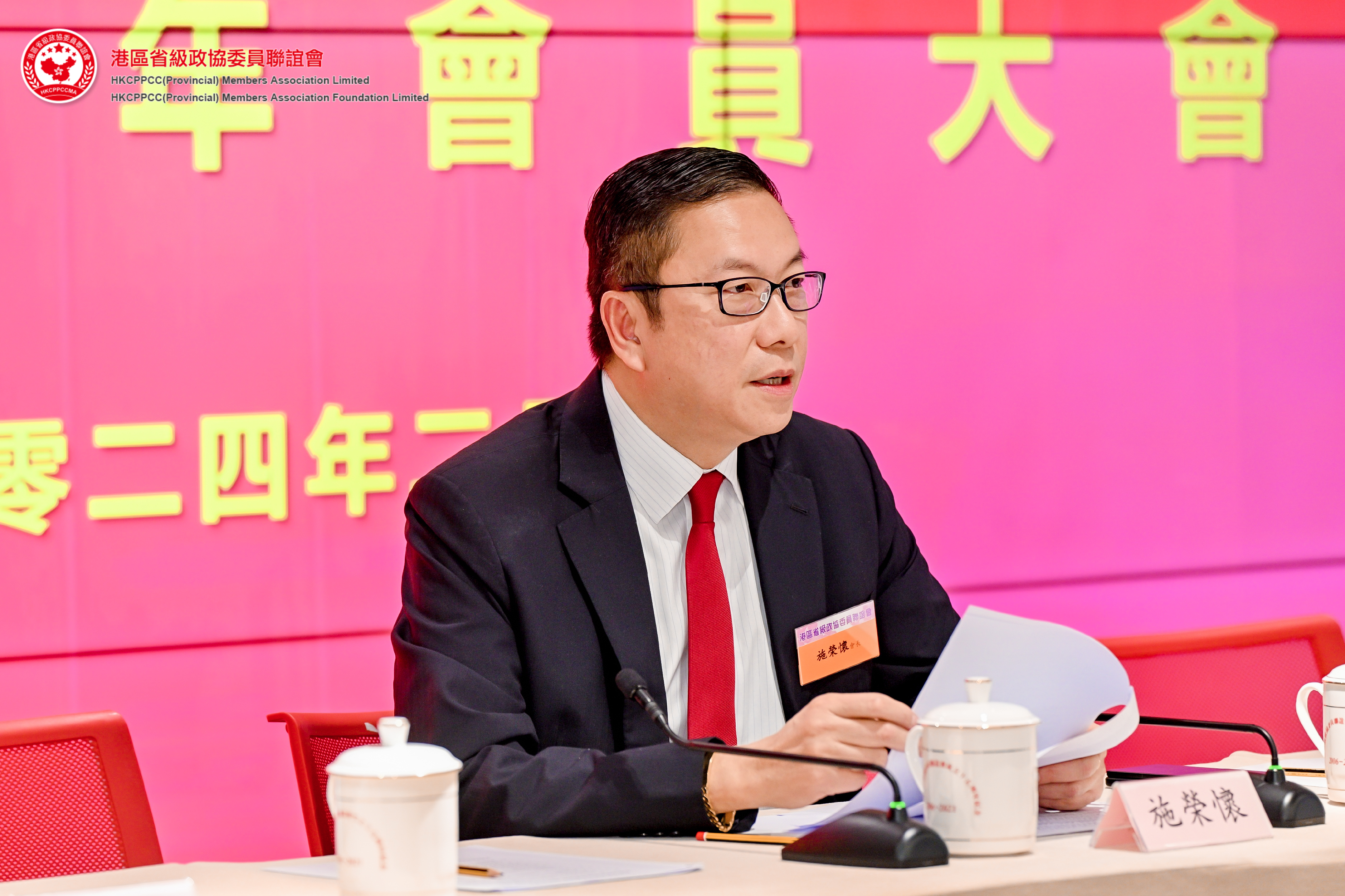 第六届理事会会长施荣怀报告过去一年该会主要的会务工作。他指出在过去一年,该会积极发动会员支持落实爱国者治港原则,完善地区治理,动员市民履行投票义务;拜访行政长官及举行了16场特区政府主要官员座谈会;接待了69场内地领导来访调研,举办了3次内地考察团、3次国情班,做好内地与香港纽带桥梁角色;筹款支持内地受灾同胞,展示同舟共济精神;欢迎新委员,团结老委员,为香港发展及内地建设出谋划策;重视青年培育,让爱国爱港思想薪火相传。他表示非常荣幸能以会长的身份,与各位委员共同见证及参与众多维护香港繁荣稳定的重要事件,希望各位继续支持联谊会的会务工作、支持第七届理事会。
