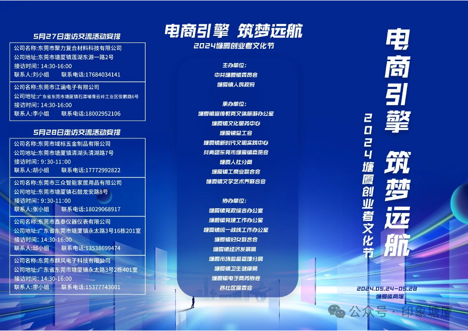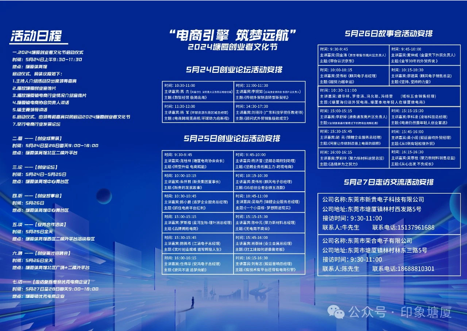 2024年塘厦创业者文化节启动仪式定于5月24日9:30至12:00,在塘厦体育馆中心舞台区将举行。活动内容包括播放创业宣传片和塘厦镇电商行业情况介绍宣传片;镇领导和特邀嘉宾将共同启动2024年塘厦创业者文化节。同时将举行电商行业发展论坛。