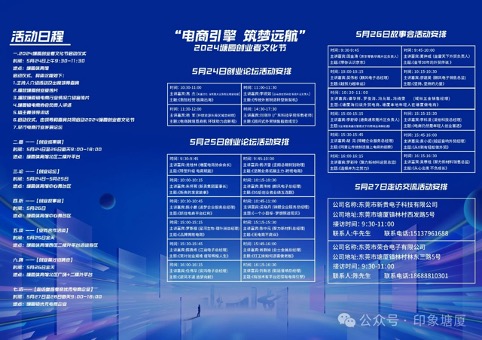 创业论坛则邀请专家和业界精英,就电商行业进行专题讲座,分析行业趋势、技术技巧等,为创业者规划成功路径。这些活动旨在通过生动的故事和专业的讲座,为创业者们提供经验参考和精神支持,助力他们在创业道路上取得成功。创业论坛定于5月24日10:30—12:00;14:30—17:30;5月25日9:30—11:00;15:00—16:30各举办一场,在塘厦体育馆中心舞台区。