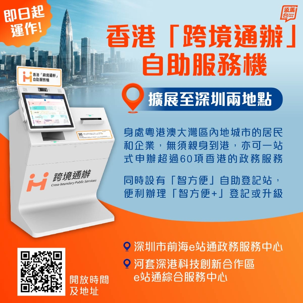 继广州设置首部香港「跨境通办」自助服务机后,由即日起,深圳亦新增两个设置点,方便身处粤港澳大湾区内地城市的居民和企业,无须亲身到港,亦可一站式申办超过60项香港政务服务。