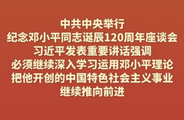 中共中央22日上午在人民大会堂举行座谈会,纪念邓小平同志诞辰120周年。中共中央总书记、国家主席、中央军委主席习近平发表重要讲话。他强调,邓小平同志是全党全军全国各族人民公认的享有崇高威望的卓越领导人,伟大的马克思主义者,伟大的无产阶级革命家、政治家、军事家、外交家,久经考验的共产主义战士,党的第二代中央领导集体的核心,中国社会主义改革开放和现代化建设的总设计师,中国特色社会主义道路的开创者,邓小平理论的主要创立者,为世界和平和发展作出重大贡献的伟大国际主义者。他对党、对人民、对国家、对民族、对世界作出了突出贡献,功勋彪炳史册、永励后人。