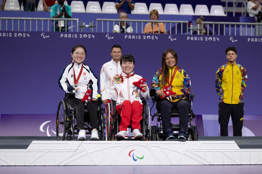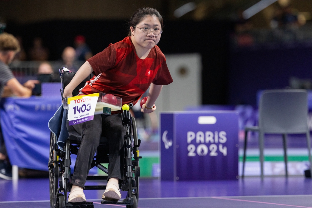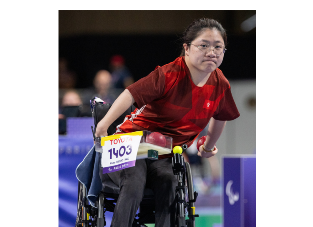 可喜可贺:张沅(左)在2024年巴黎残疾人奥运会硬地滚球女子个人BC4级赛事勇夺银牌。(中国香港残疾人奥委会提供相片)李家超表示,首次参与残奥会的张沅面对世界各地顶尖选手仍沉着应战,表现出色,最后在女子个人BC4级赛事勇夺银牌,他和全港市民都为张沅感到自豪。