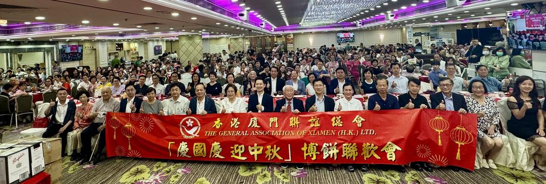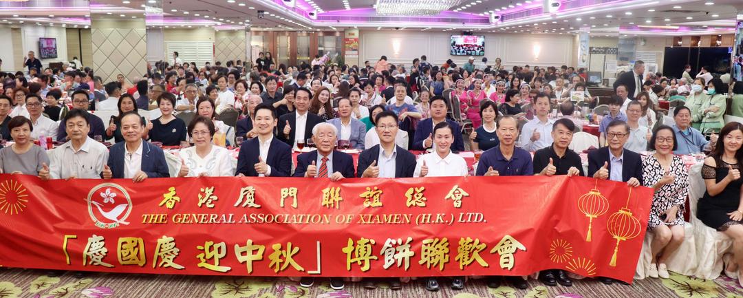 香港厦门联谊总会3 日在北角富港酒楼举办“ 庆国庆 迎中秋”“搏饼”联欢晚会。该会理事长李冠华,永远荣誉会长陈荣旋、王少华、蔡瑞义,副理事长兼秘书长李毅立, 香港福建社团联会荣誉顾问林广兆 ,副主席兼秘书长佘德聪,香港福建社团联会港岛东分会执行会长柯文华,香港岛各介联合会北鲗地委会主席李莉 ,东区警署警长史明丽,南方影业总经理林云华,漳龙实业副总经理黄军英, 香港福建社团联会常务副秘书长兼总干事周珊珊等与厦联会会员乡亲逾500人参加了活动。 与会宾主在厦门传统习俗活动—中秋“搏饼”欢乐声中和会员欢歌热舞中 ,同庆伟大祖国成立75 周年, 共迎传统中秋佳节。