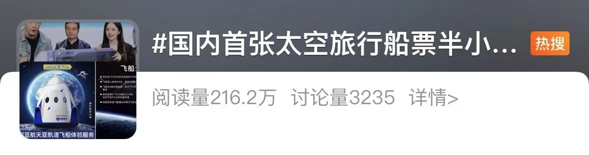 日前,一款名为“亚轨道飞船体验服务太空舱2027年首飞”的商品在某电商平台上架,并在一个电商直播间里以100万元的价格售卖,预售价5万元。记者了解到,这是由国内一家商业航天公司推出的亚轨道旅行项目,面向大众公开售卖同类商品在国内尚属首次。