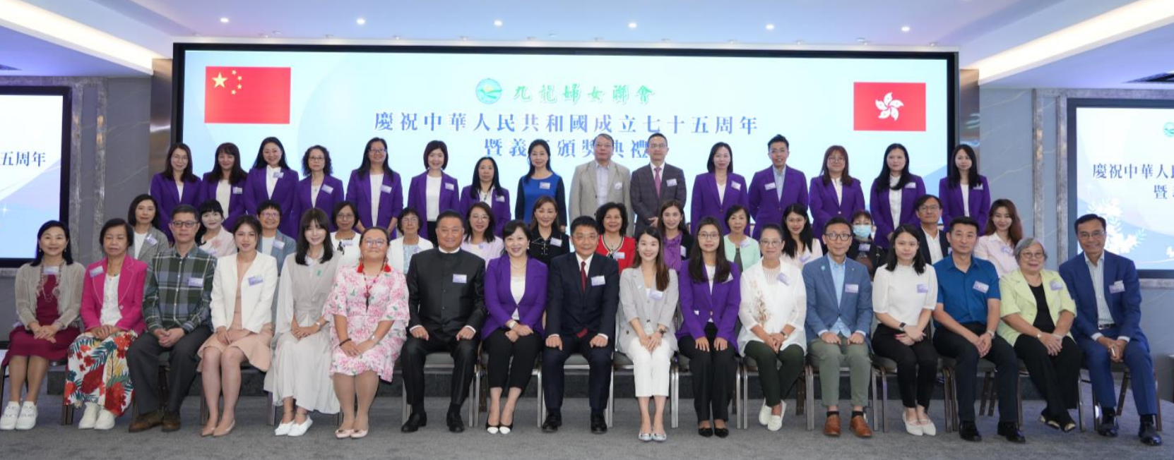 九龙妇女联会“庆祝中华人民共和国成立七十五周年暨九龙妇女联会义工颁奖典礼”于 10 月 19 日举行。中央人民政府驻香港特别行政区联络办公室九龙工作部副部长郭长勇、香港特别行政区民政及青年事务局妇女事务专员陈乐雅、港区全国人大代表陈振彬、全国政协委员张佐姣、九龙城民政事务专员蔡敏君、深水埗民政事务专员黄昕然等应邀出席主礼。