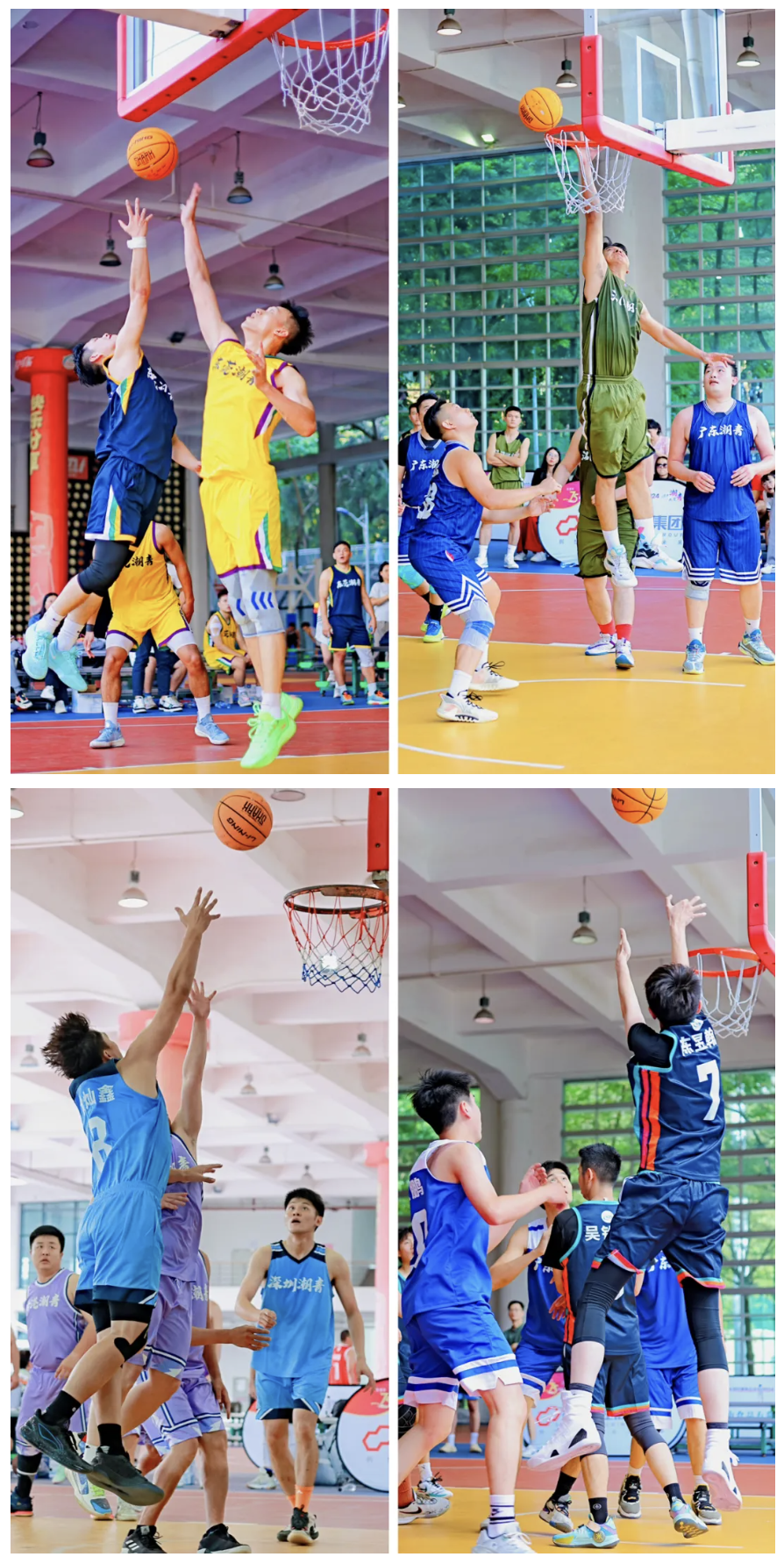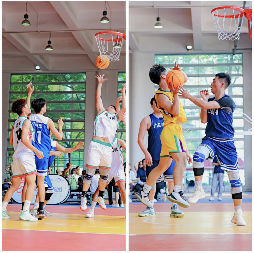 篮球赛场上,球员们球技精湛,配合默契。奔跑、跳跃,突破层层防守,精准上篮;过人、妙传,默契配合进攻,远投得分,一次次拼抢,一次次跃起,行云流水的动作、交替上升的比分,将比赛推向一个又一个高潮。