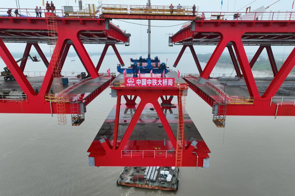 “斜拉段结构对温度影响不太敏感,但悬索段结构对温度影响非常敏感。合龙前期,我们发现与悬索连接的钢梁受温度影响高差最大达40厘米。”中铁大桥局G3铜陵长江公铁大桥项目总工姚森表示,针对这一情况,在合龙段钢梁安装过程中,项目团队选择在相对恒定的温度下快速完成施工,同时,结合主缆吊装受力不断变化,施工人员采用悬臂段调索、悬吊段配重、合龙口反压、移动配载以及斜拉段纵向主动顶推等措施,以保证合龙口的高差和转角满足合龙要求,最终完成钢梁的毫米级精准合龙。