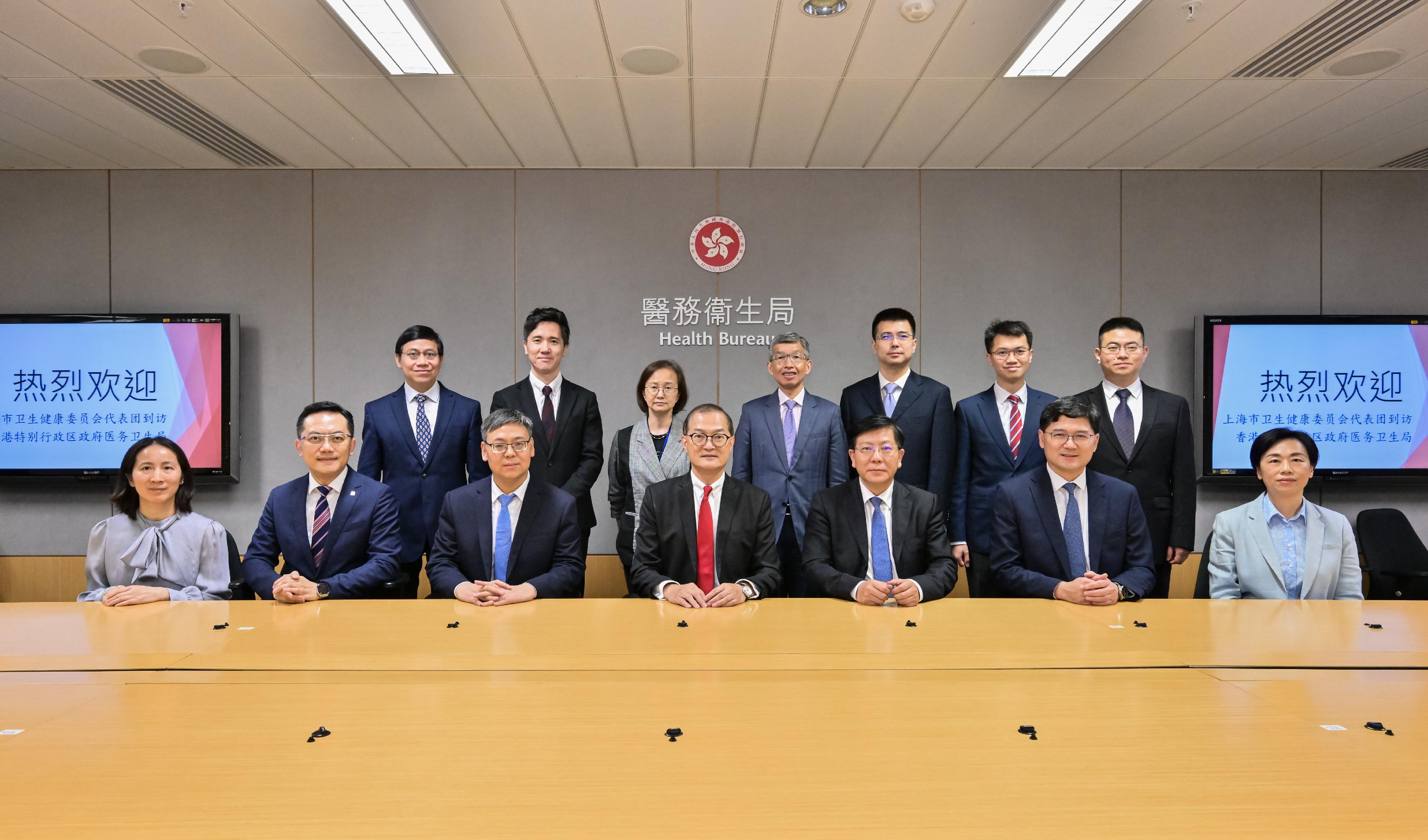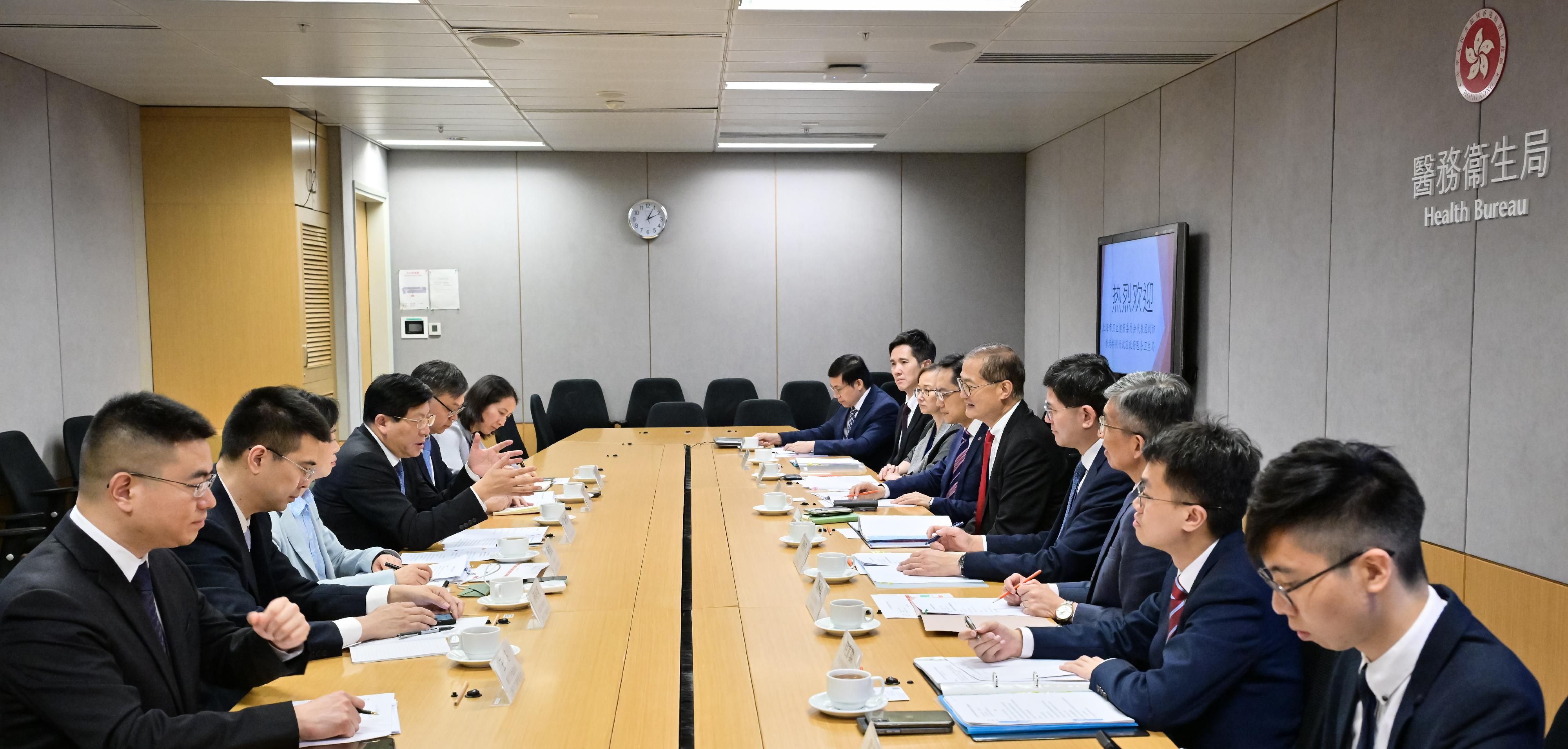医务卫生局(医卫局)局长卢宠茂教授今日(四月二十六日)与上海市卫生健康委员会主任闻大翔教授率领的代表团举行会议,就深化沪港两地医疗卫生合作进行交流。