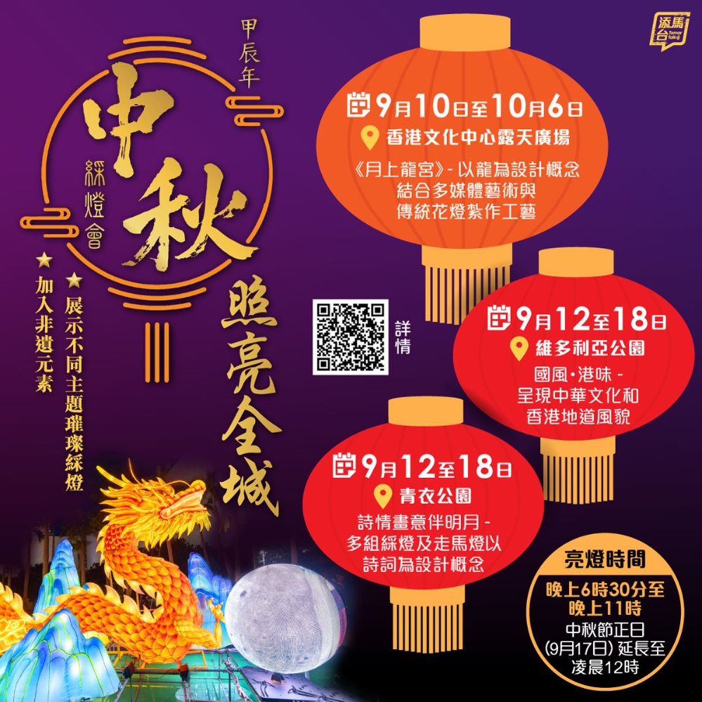 为庆祝中华人民共和国成立75周年,并与市民共度中秋佳节,彩灯《月上龙宫》在香港文化中心露天广场水池展出,甲辰年中秋彩灯会亦正式揭开序幕。连同将于维多利亚公园和青衣公园举行的中秋彩灯会,3个彩灯活动展示不同主题的璀璨彩灯之余,同时加入非遗元素,如英歌舞、民族歌舞、传统花灯扎作展示、舞火龙、粤港澳传统手工艺示范,并增设华服秀及中秋市集等。看图了解更多。