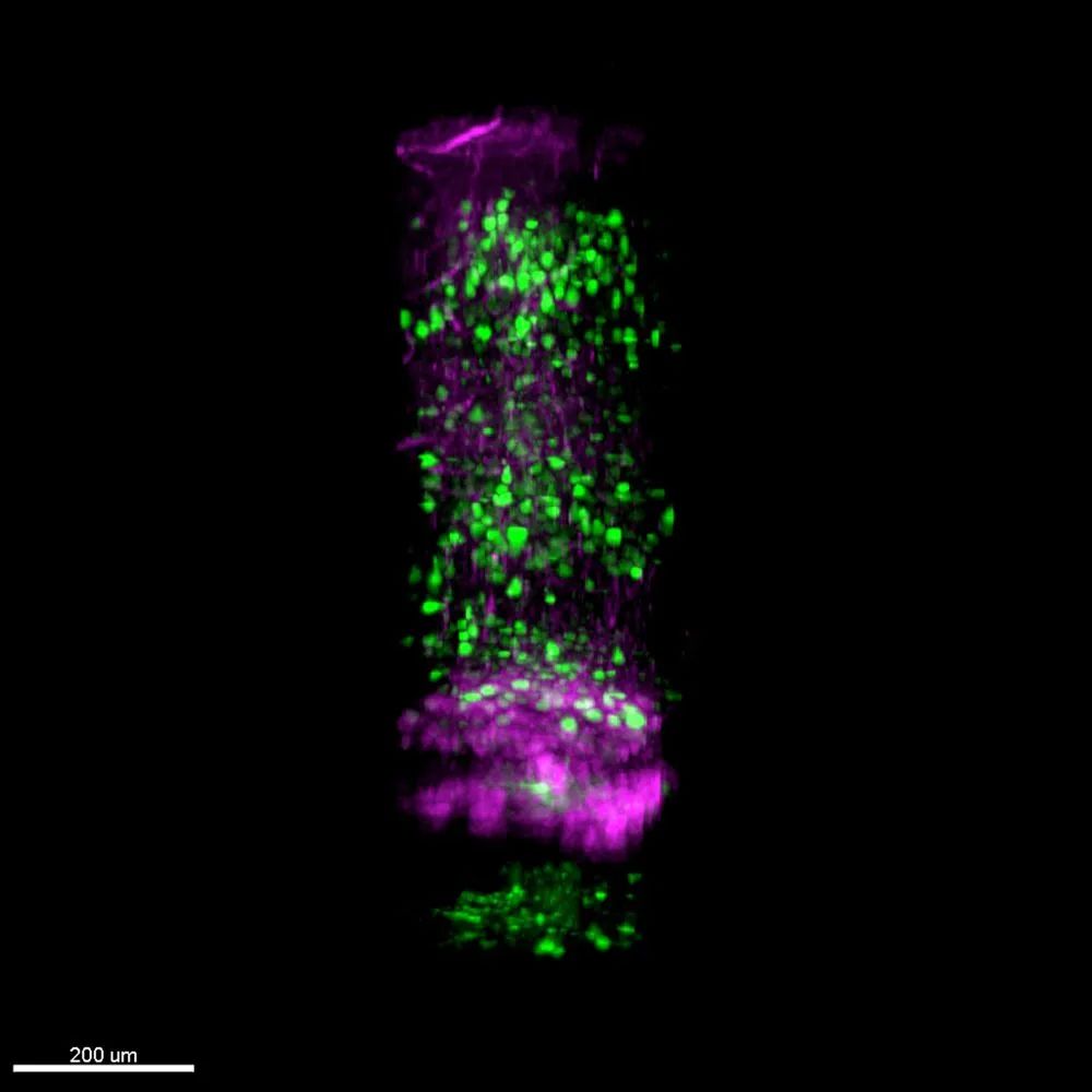 据悉,此次新研制的微型化三光子显微镜一举突破了此前的成像深度极限:显微镜激发光路可穿透小鼠大脑皮层和胼胝体,实现对小鼠海马CA1亚区的直接观测记录,神经元钙信号最大成像深度可达1.2毫米,血管成像深度可达1.4毫米。