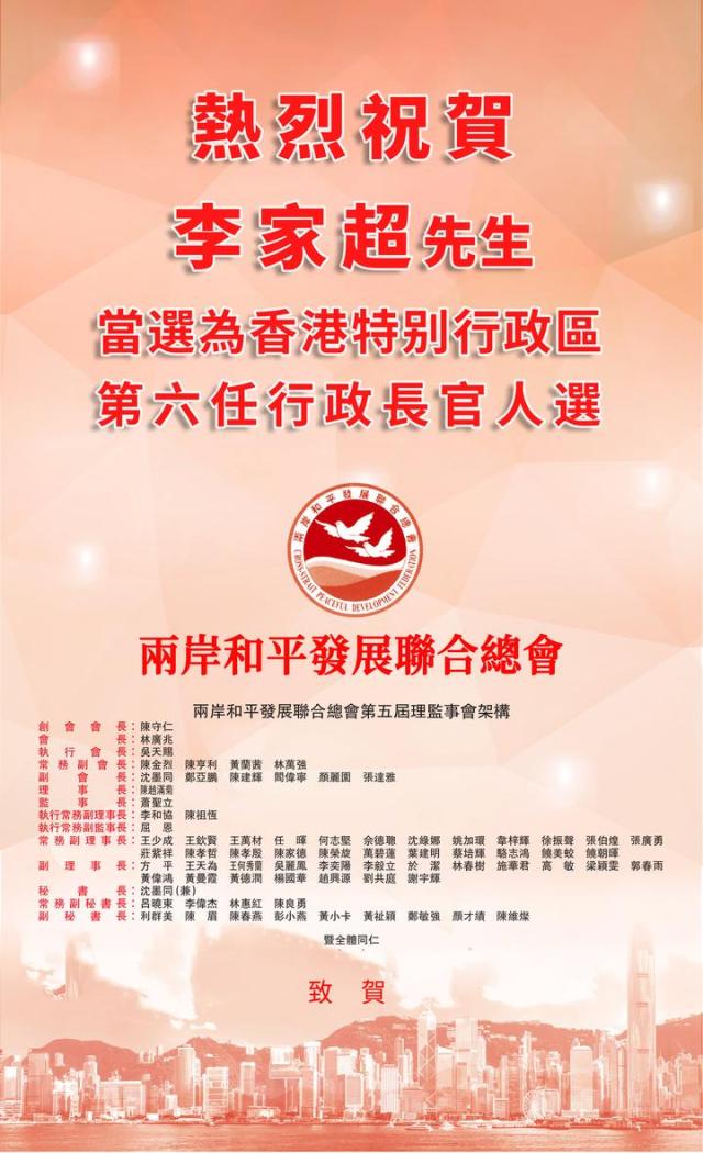 两岸和平发展联合总会热切期盼以李家超先生为主的下届特区政府,能够以行动获取信任,以结果缩小分歧,以成绩凝聚互信,齐心协力将香港建设成更宜居、更开放、更和谐,充满希望、机遇和活力的城市。