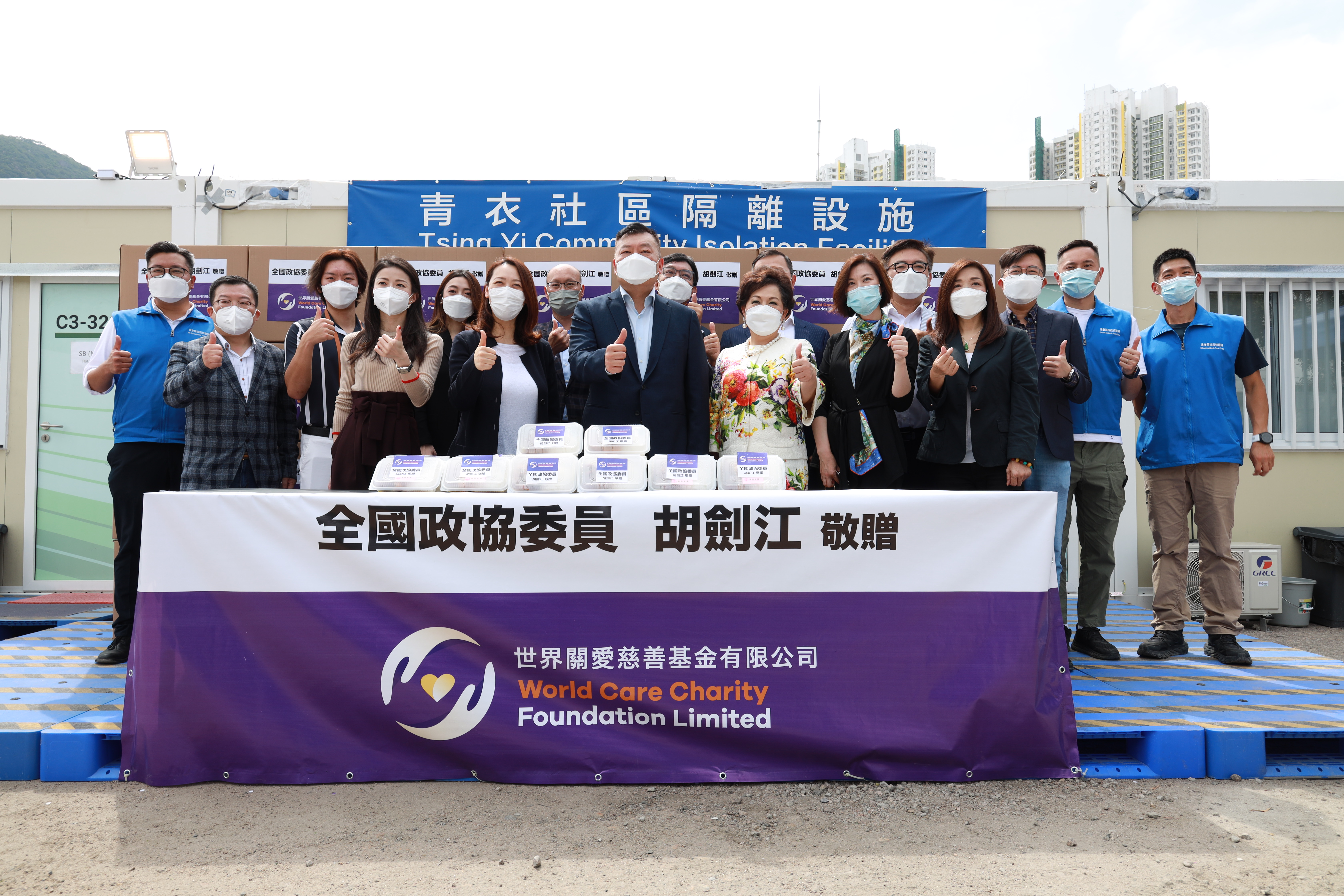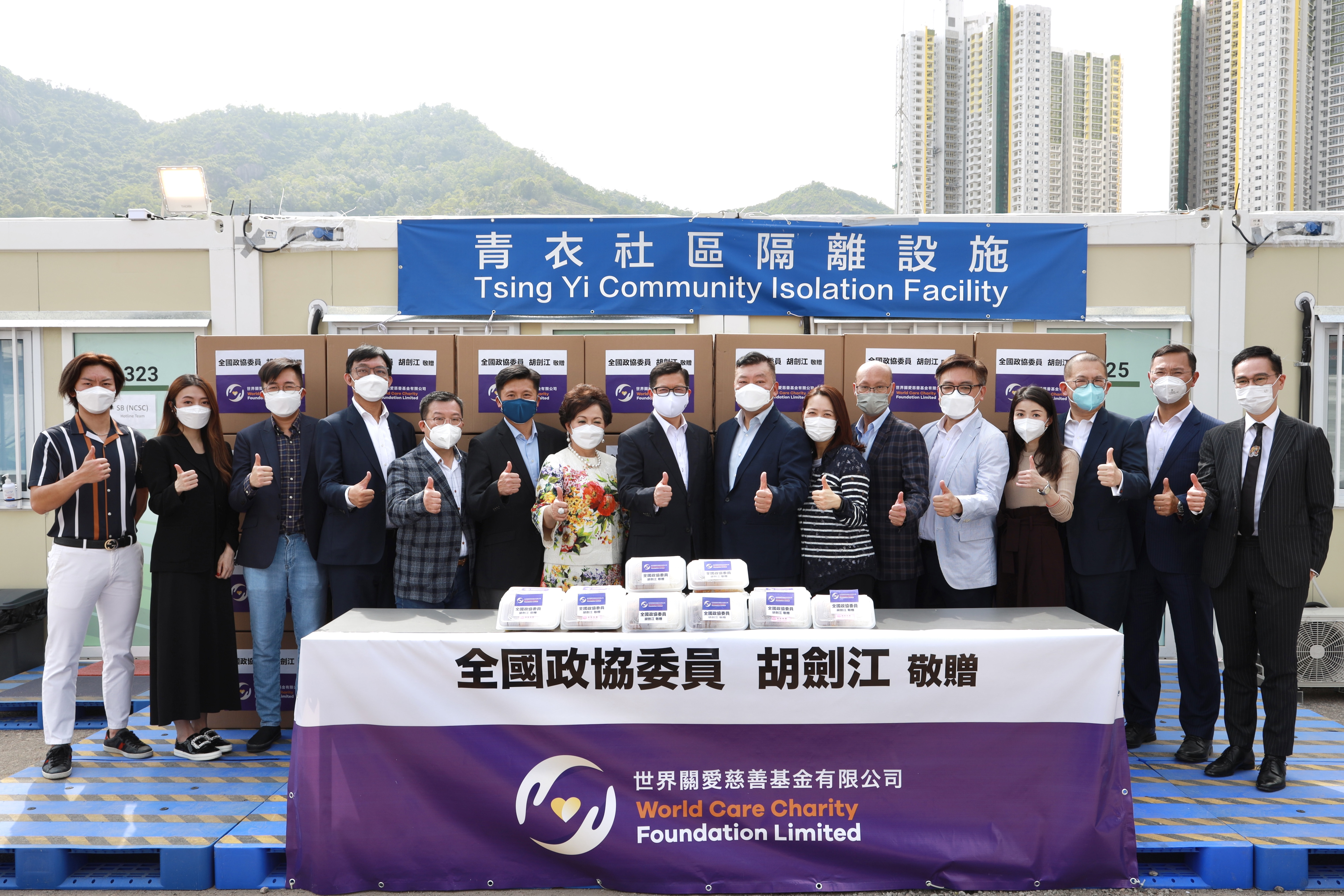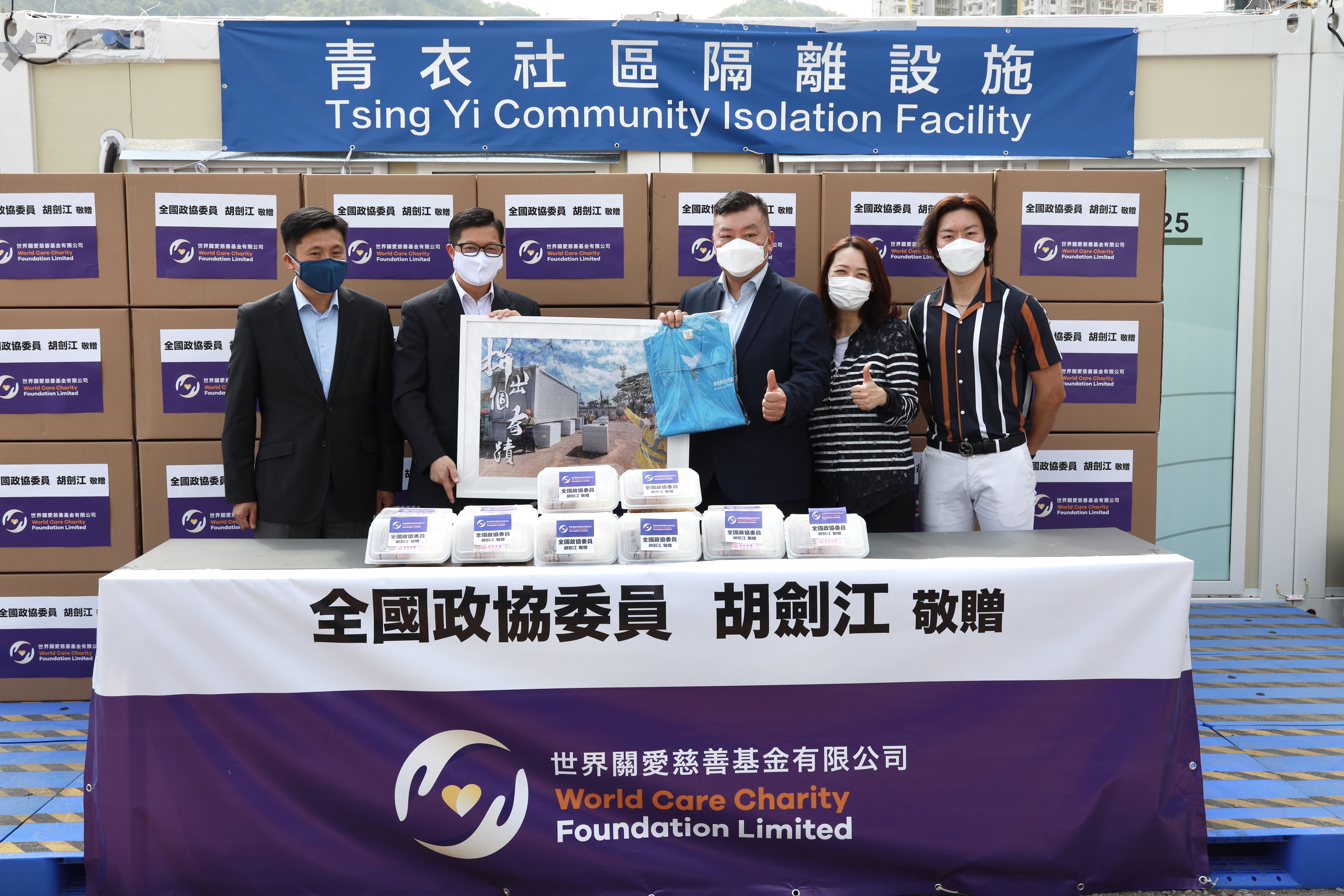 第五波疫情虽然稍缓,由中央援建的社区隔离设施(方舱医院)仍全天候投入服务,未敢松懈。为了向无私奉献的工作人员表达敬意,全国政协委员、香港胡良利集团(控股)有限公司创办人及主席、香港潮州商会永远荣誉会长胡剑江及其家族慈善基金“世界关爱慈善基金有限公司”,特别向保安局抗疫特遣队统筹下所有方舱医院之全体工作人员捐赠一个月之膳食。有关捐赠仪式于4月22日在青衣方舱医院举行,由保安局局长邓炳强代表接受。