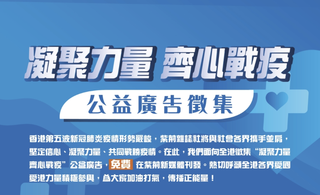 在此,我们面向全港征集“凝聚力量 齐心战疫”公益广告,免费在紫荆新媒体刊发。为大家加油打气,传播正能量!热切呼吁全港各界爱国爱港力量勇于担当,为社会作出表率,带动全社会万众一心、攻坚克难、齐心战疫,共同为市民带回健康平安、和谐稳定的生活。