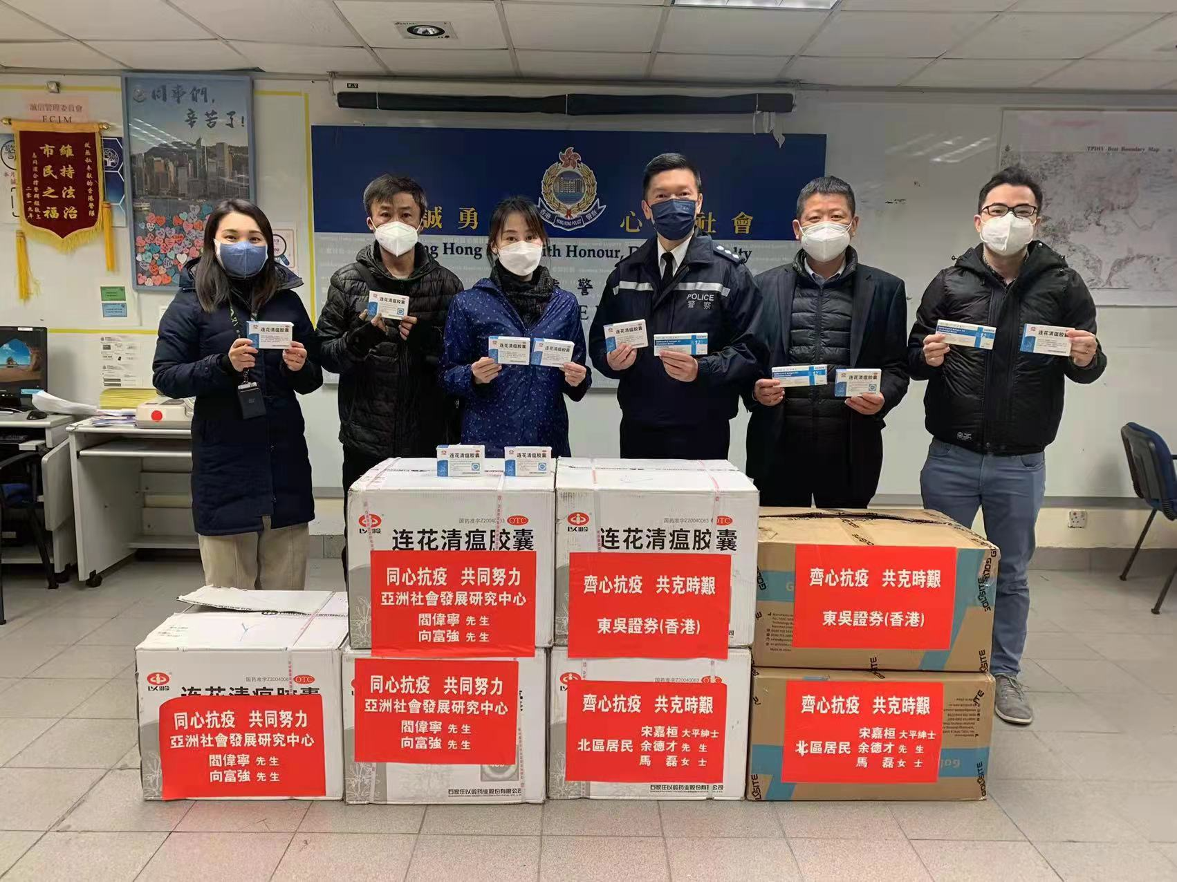 今日(21日),港区省级政协委员、香港亚洲社会发展研究中心主任阎伟宁,港区省级政协委员、太平绅士宋嘉桓,娱美德元宇宙科技研究院余德才,东吴证券(香港)高级经理马磊,汕尾市政协委员、香港中旅维景国际酒店管理有限公司董事张琪腾等一行,运送价值20万港元的抗疫物资前往香港警察大埔警署慰问在抗疫一线的警员。