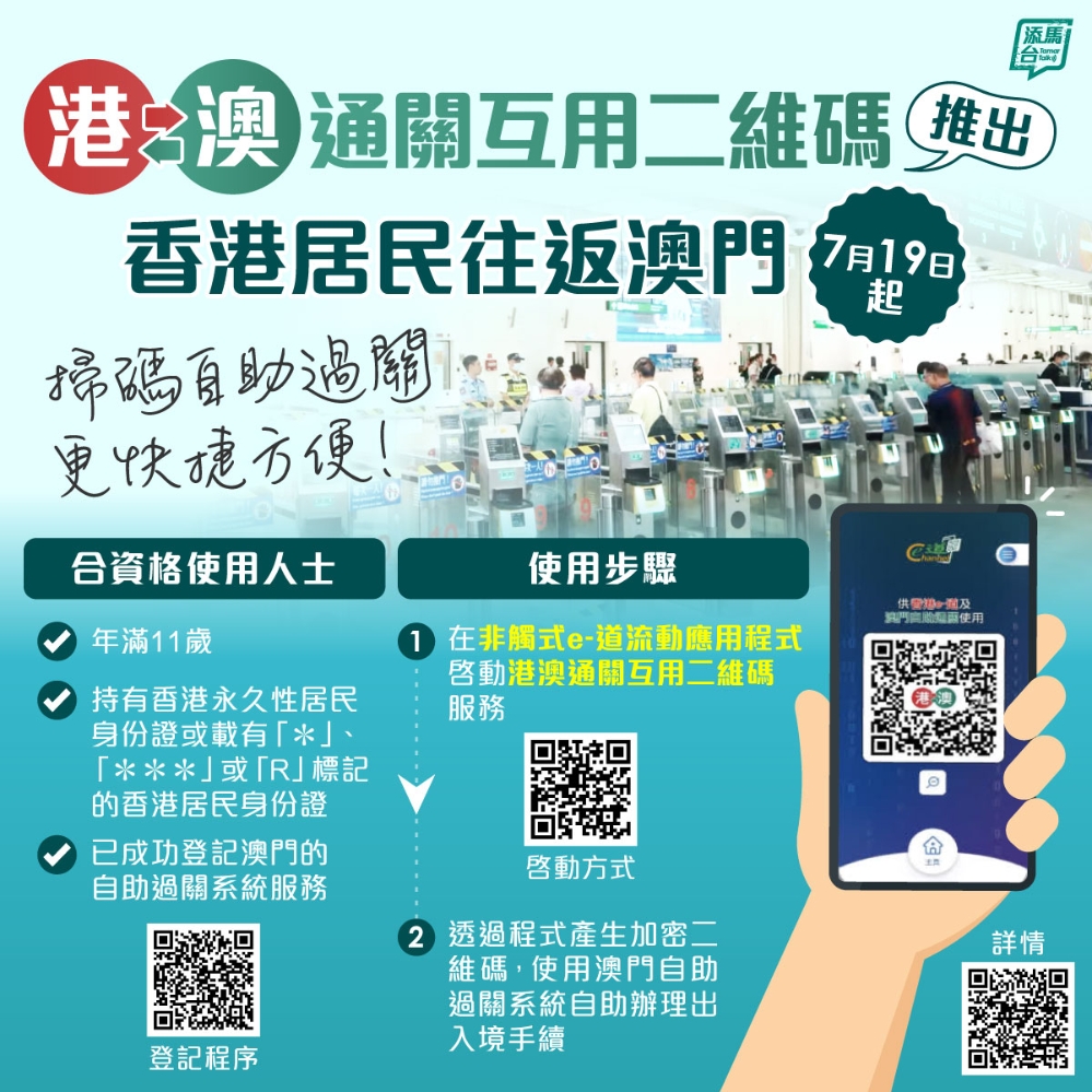 入境处将于7月19日与澳门当局合作推出「港澳通关互用二维码」服务,为合资格的香港及澳门居民带来更快捷、方便的出入境检查服务。