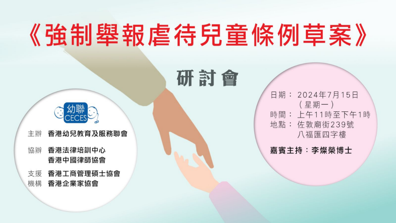 为了推动教育业界人士对该条例的认识,以及了解他们的意见和需求,CECES香港幼儿教育及服务联会(下称:幼联)于7月15日举办研讨会,香港法律培训中心及香港中国律师协会协办,香港工商管理硕士协会及香港企业家协会支持。为幼稚园教师及校长安排法律界代表、教育界代表、培训专家以及议员等,为教育工作者提供专业意见,以及相关培训及支援服务,提高他们对该条例的法律意识,以致其在执行职责时不会招致法律责任。幼联总干事程德智指出,幼联通过不同的交流会和研讨会,以及针对条例的相关会员服务,促进社会上形成一种互助精神,共同面对新法例带来的挑战。