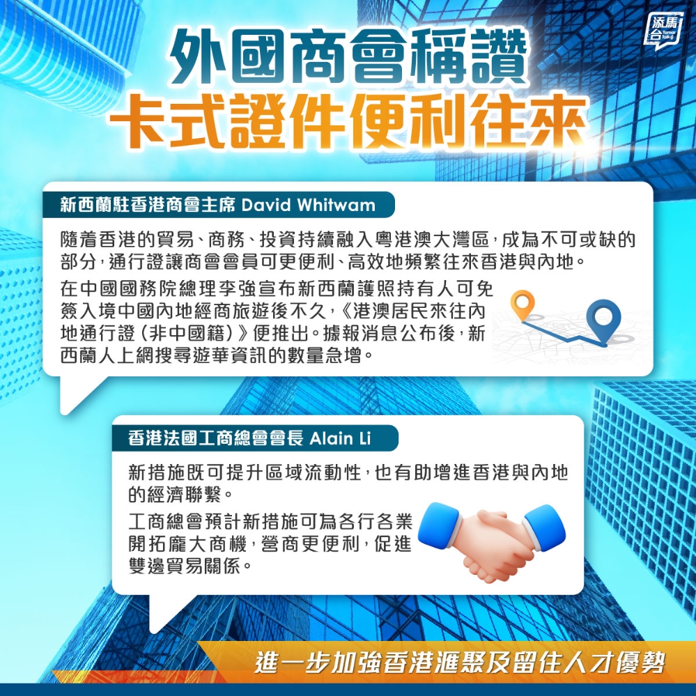 继7月1日的公布,国家出入境管理局7月10日起向非中国籍香港永久性居民签发《港澳居民来往内地通行证(非中国籍)》,新西兰驻香港商会、香港法国工商总会同表欢迎。看图了解更多。