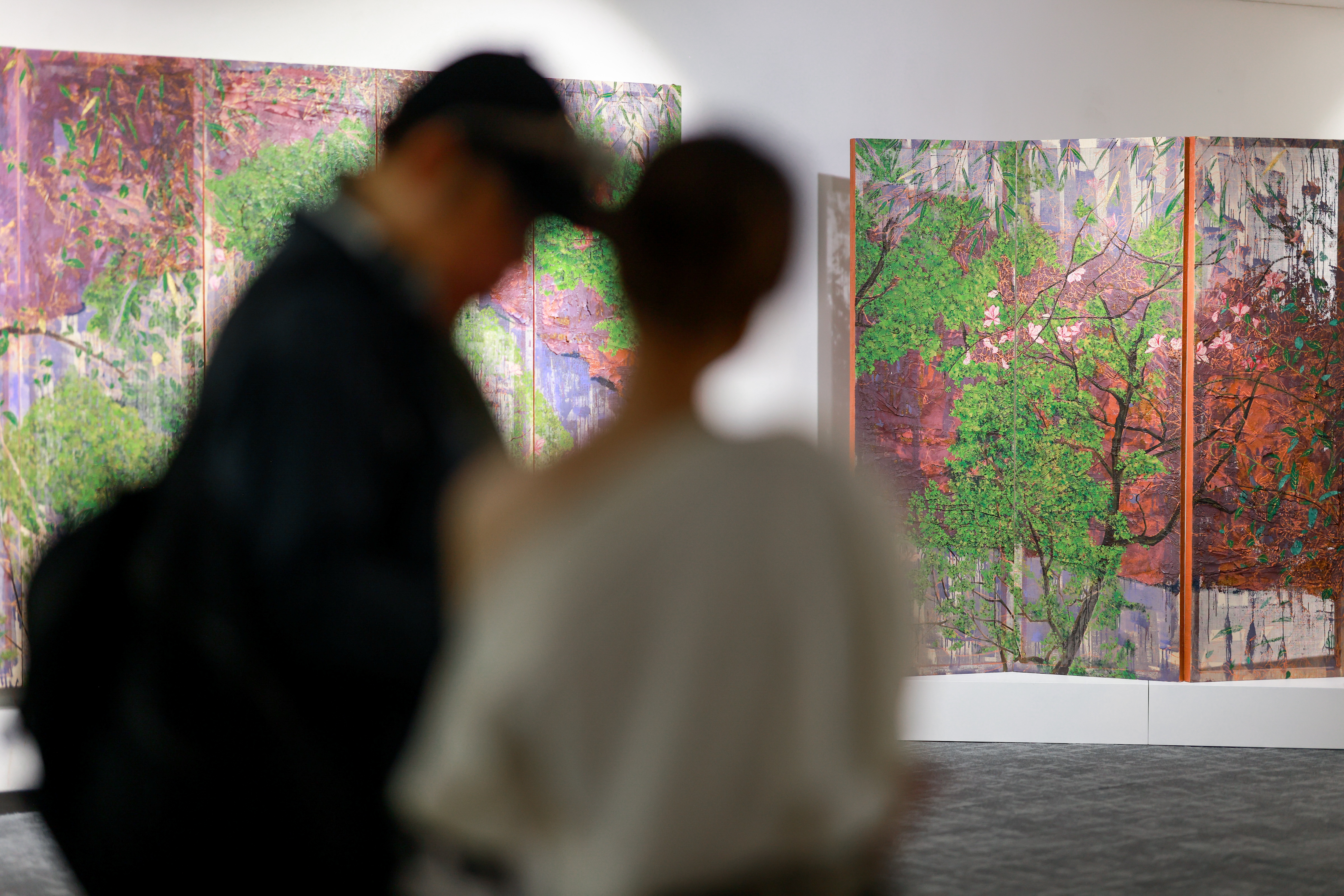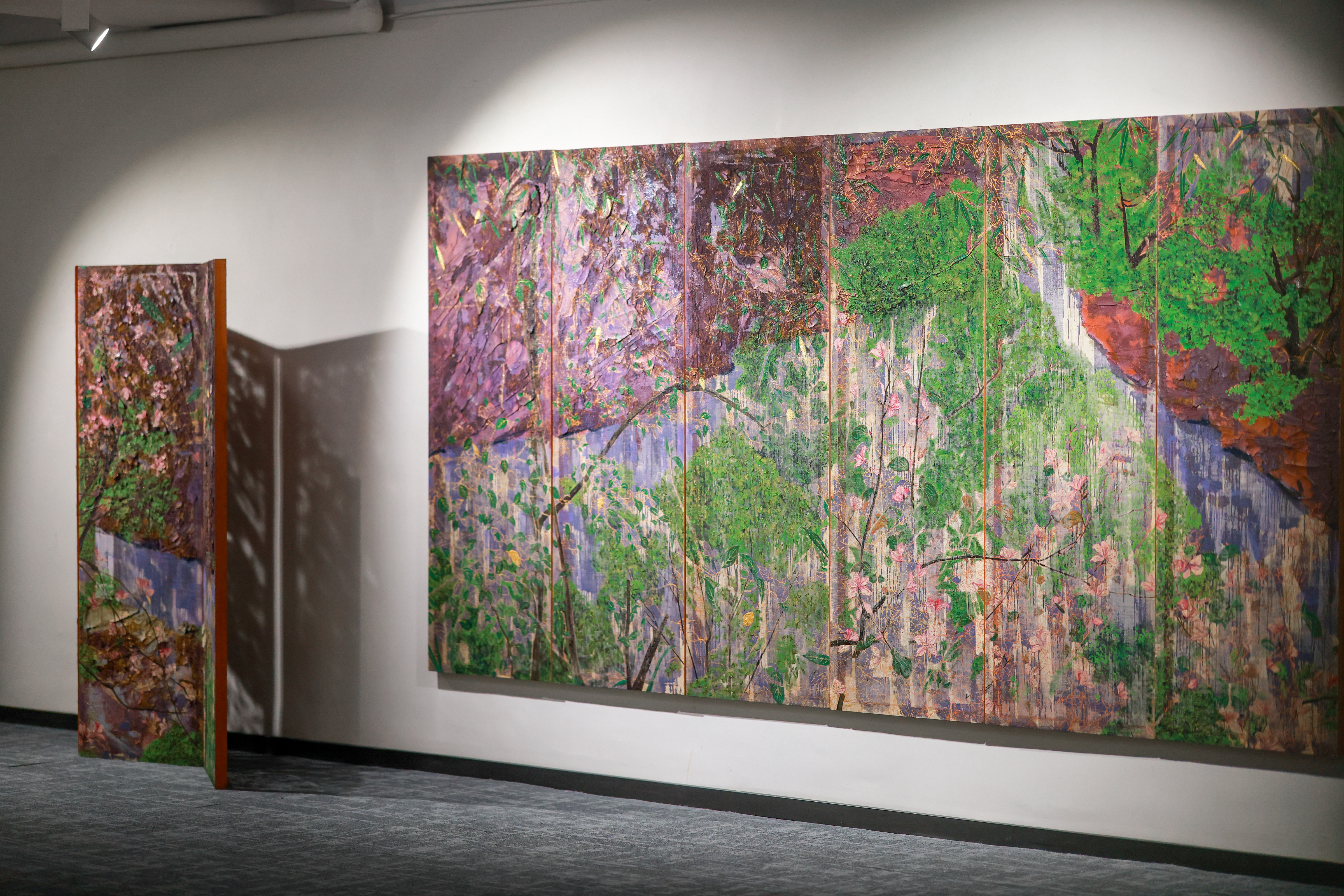 创作于2020年的作品《山涧》是本次展览最大尺幅的作品,这座高达一米八的十二扇屏风令人想起艺术家被上海香奈儿总部收藏的《早春图》。作为香奈儿中国唯一合作的艺术家,吴观真的作品备受时尚界亲睐,并无数次刊登于各大时尚杂志中,成为其中一股清新的气息。