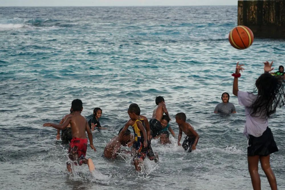 瑙鲁不大,议会大楼、博物馆、二战纪念碑等知名景点都体现出太平洋岛国的历史文化特色。鱼市场不远处的沙滩旁,碧蓝的海面一望无际。夕阳西下,当地儿童在沙滩上追逐、嬉戏。