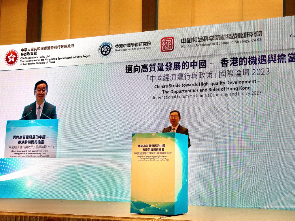 11月15日,香港特别行政区政府特首政策组、香港中国学术研究院及中国社会科学院财经战略研究院于政府总部主办迈向高质量发展的中国──香港的机遇与担当“中国经济运行与政策”国际论坛2023。冯氏集团利丰研究中心和紫荆杂志社为协办单位。中国社会科学院院长高翔出席开幕式并发表演讲。他表示,高质量发展是中国式现代化的本质要求,也是全面建设现代化国家的首要任务。党的十八大以来,习近平主席审时度势,基于我国发展环境和发展条件的深刻变化,洞察经济社会发展的阶段性特征,作出必须走高质量发展之路的重大判断。