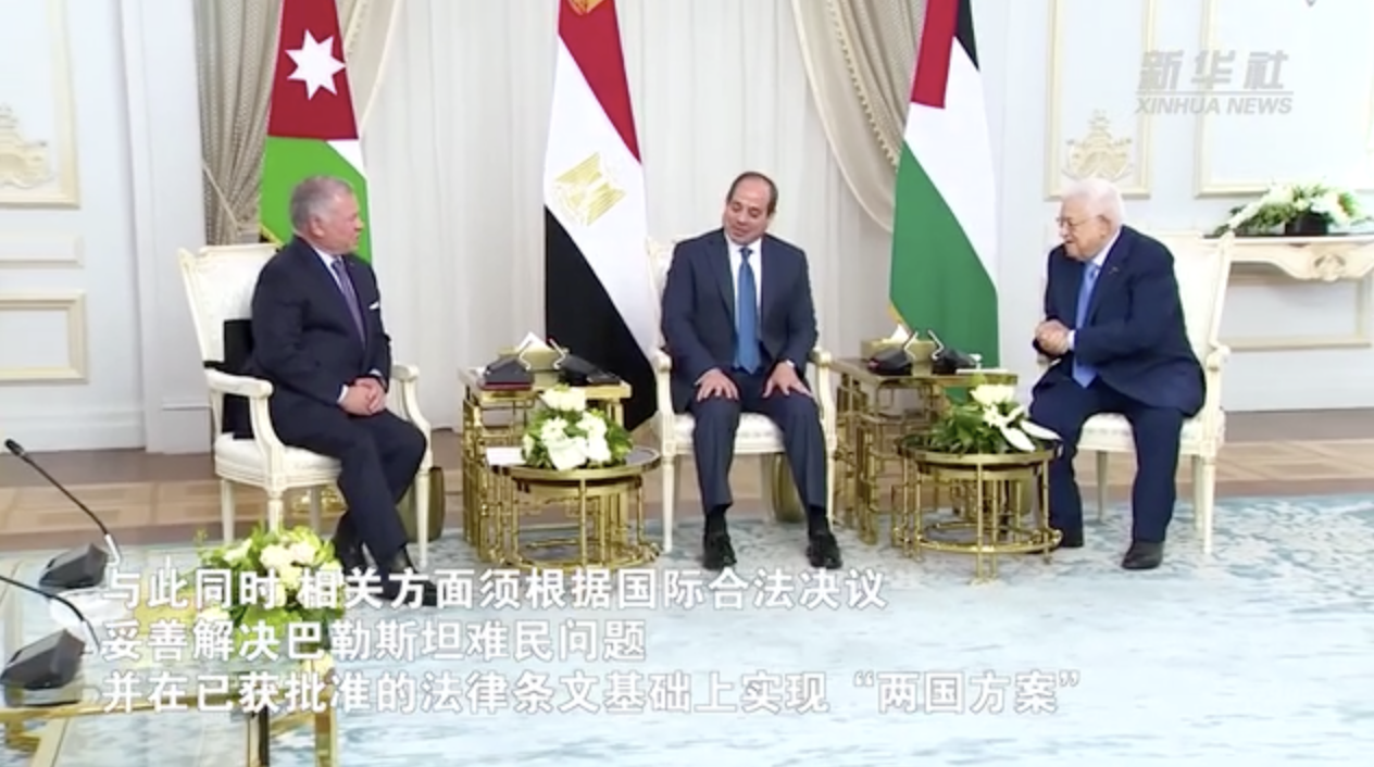 埃及总统府在会后发表声明说,埃及总统塞西、约旦国王阿卜杜拉二世和巴勒斯坦总统阿巴斯在会上表示,巴勒斯坦人民理应获得他们的全部合法权利,包括建立以1967年边界为基础、以东耶路撒冷为首都、享有完全主权的、独立的巴勒斯坦国的权利。与此同时,相关方面须根据国际合法决议妥善解决巴勒斯坦难民问题,并在已获批准的法律条文基础上实现“两国方案”。