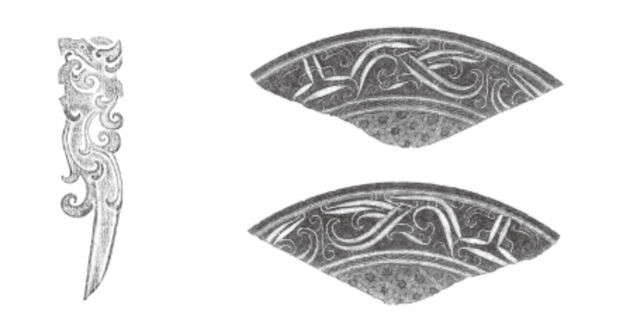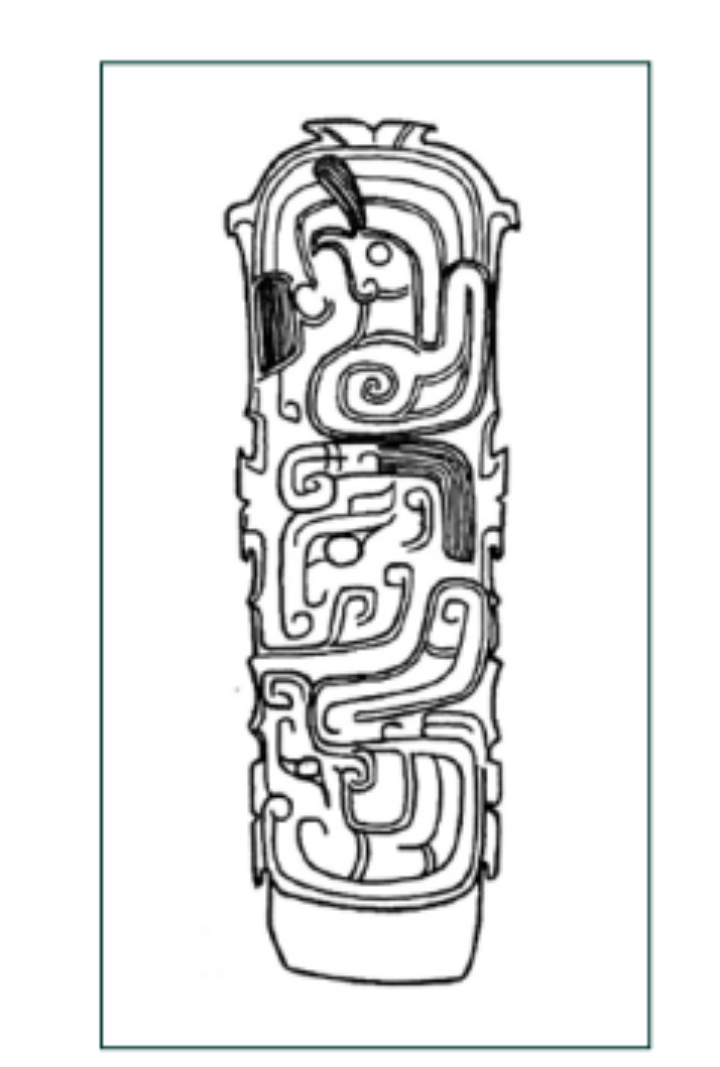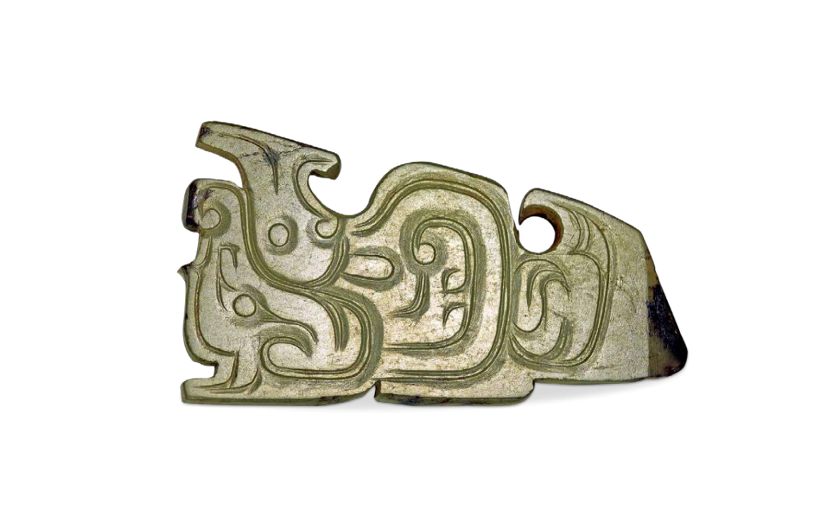 龙凤纹柄形器(西周)片状柄型器,青白玉质,局部受沁,莹润。双阴起阳雕龙凤合体纹饰。保留部分商代晚期制玉风格,同时期少见。