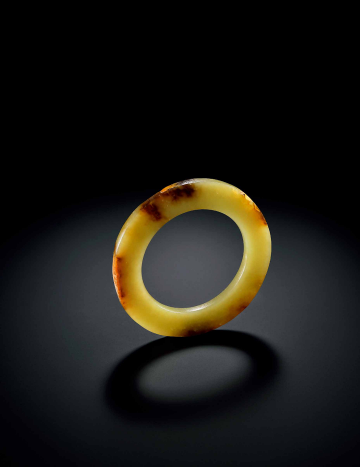 黄玉质,轻微红沁。玉环厚度均一,器型圆弧规整,包浆厚重,光洁明亮,古朴莹润,具大美之气。
