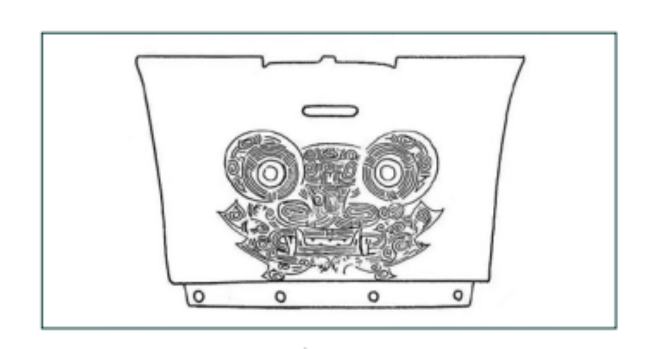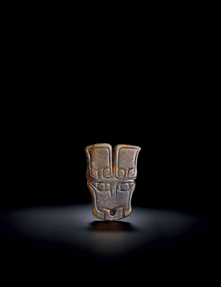 玉兽面(商代),透闪石,局部受沁呈褐黄色,臣字眼,立耳,内饰卷云纹,口部简单两道阴线凸显獠牙状,有穿孔,整体器型的纹饰简约明快,寥寥数笔便交代了兽面的威严与神秘。