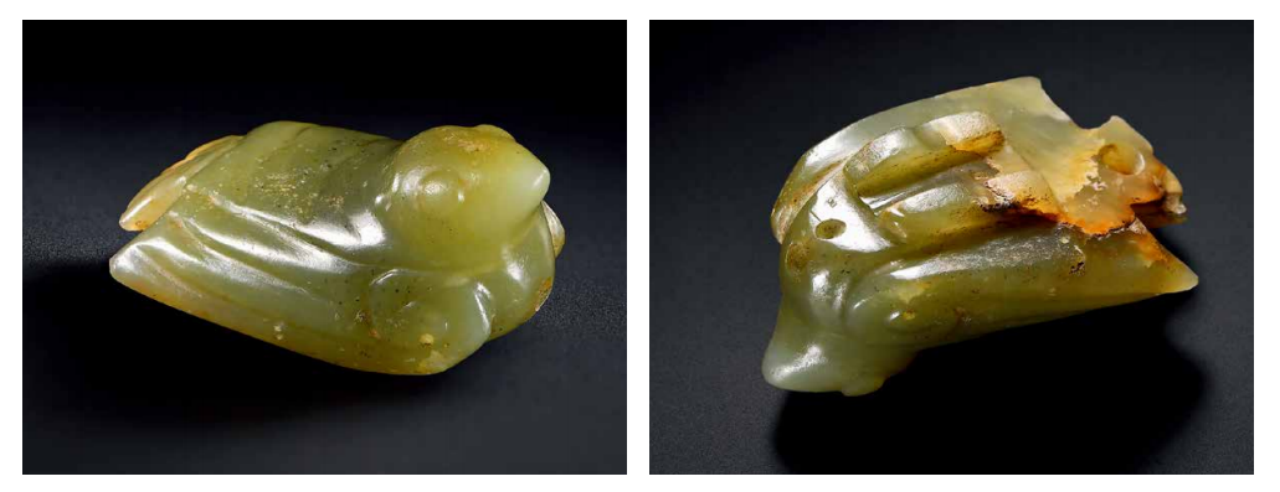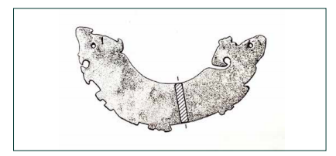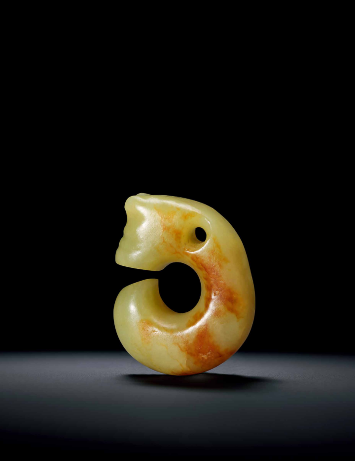 玉猪龙红山文化晚期约西元前3500年至3000年,此玉龙为红山文化主要题材,黄玉,带红沁。龙体卷曲优美,呈「C」字形,明显具备猪首的特征。整体光素,生动自然。背部对穿孔似供配戴之用。猪龙是史前先民所崇拜的图腾象征,神秘而素雅。具有很高的观赏研究价值,是所发现最早的史前文明重要玉器代表之一。