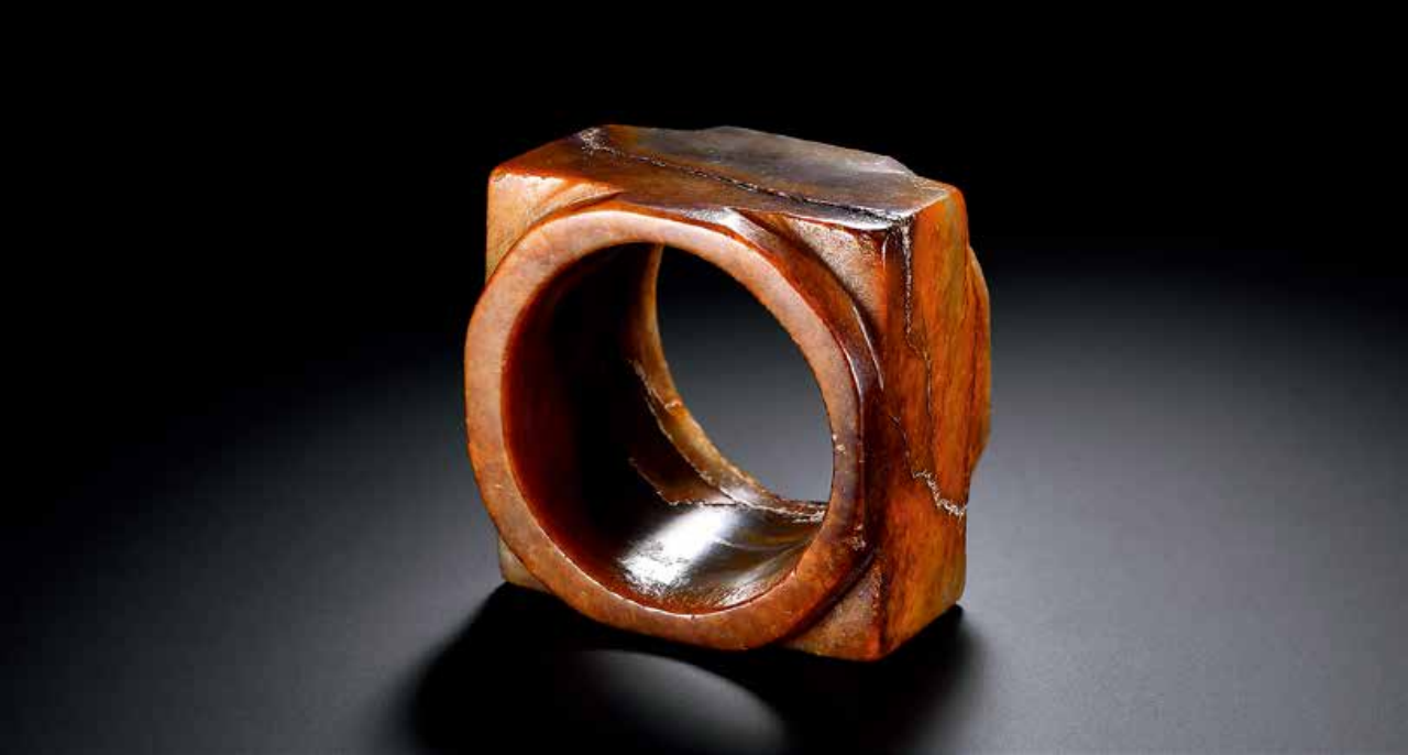 玉琮(新玉琮(新石器时代),闪石玉,黄褐色,质地细腻糯透,局部保留自然绺裂和风化皮层,整体受沁呈赭红色,色调斑斓古朴。扁方柱体,外方内圆,两端出环形矮射,中孔较大,孔壁磨制光滑。玉琮是中国古代用于祭祀的玉质筒状器物。
