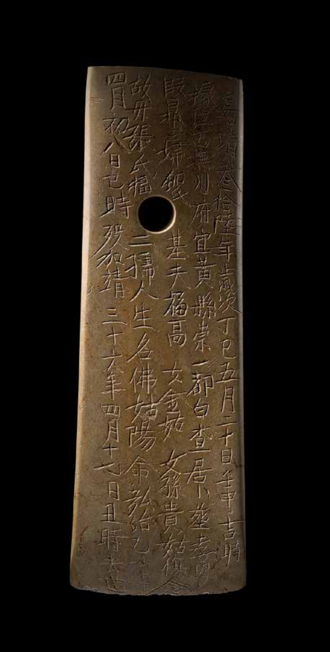 圭、细腻石质,尺寸较大,厚重,顶端对钻一孔,一端琢刃口。圭在史前时期先民作重要祭祀活动时使用的礼器。此圭在明代嘉庆年期被人所藏并正反两面刻长文墓志铭,体现了古人尊古崇古惜古,殊为特别。