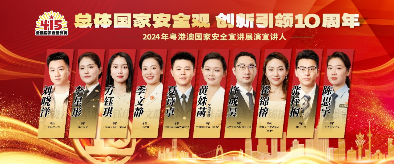 本次展演活动共有10名选手,他们是近年来参加全国、全省国家安全人民防线宣讲比赛的获奖选手代表及港、澳地区国家安全宣讲骨干。宣讲人结合各自行业、领域的工作特点,从政治安全、国土安全、能源安全、金融安全、文化安全、社会安全、科技安全、生态安全等多个方面,用鲜活的事例、铿锵的语言、真挚的情感、富有感召力的表现,阐释了自己眼中的总体国家安全观,展现了新时代粤港澳各行各业守护国家安全的强大凝聚力,是一次宣传贯彻总体国家安全观的生动实践。