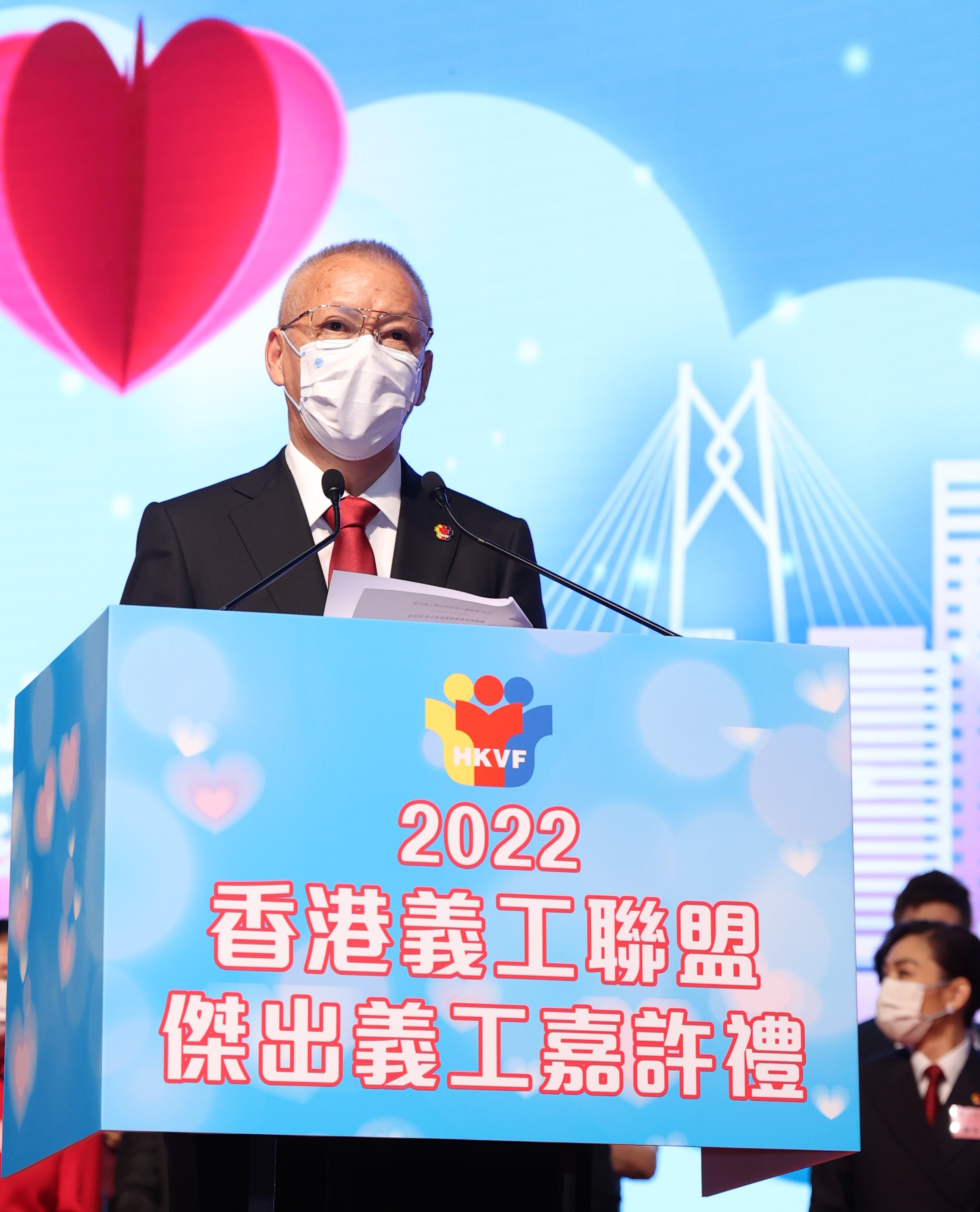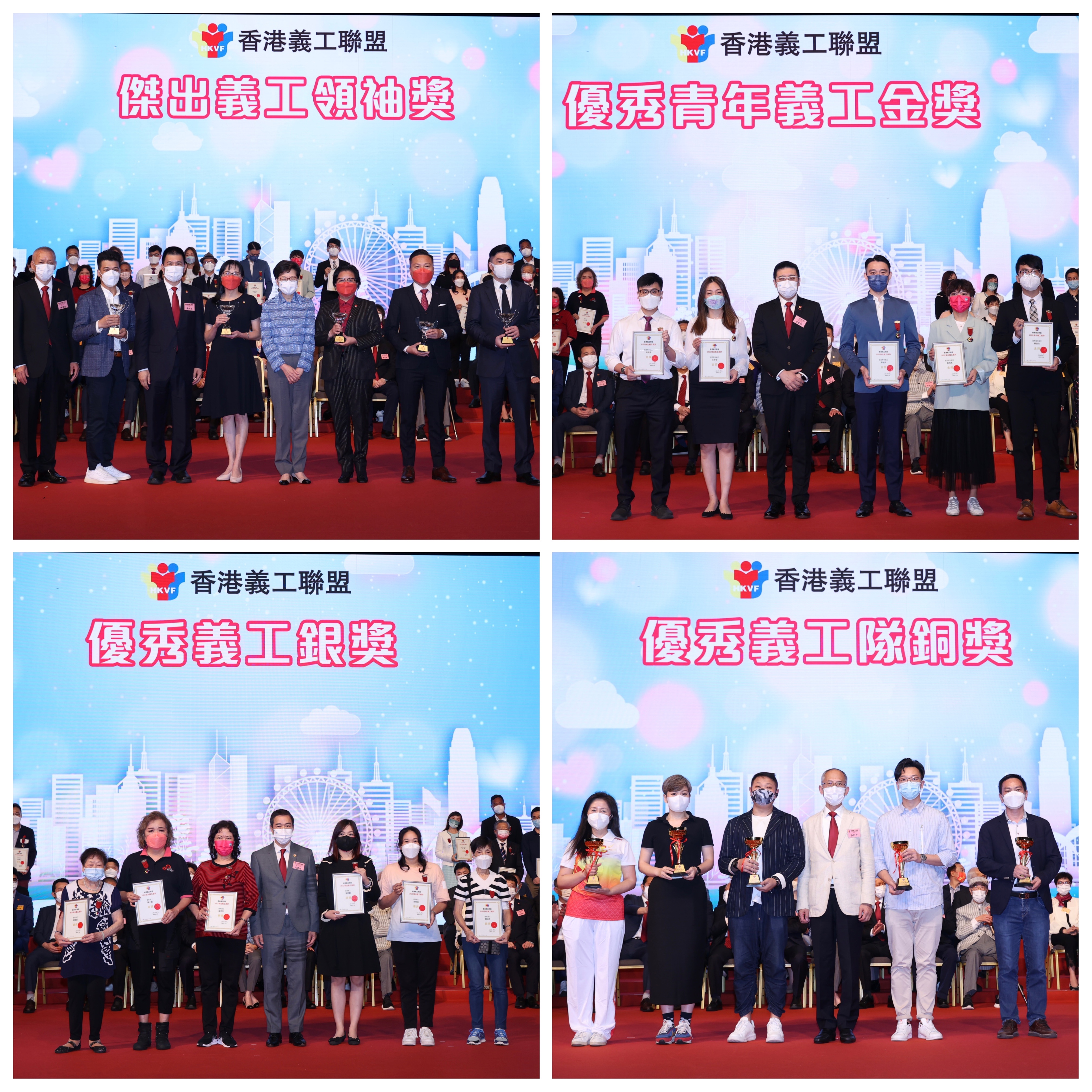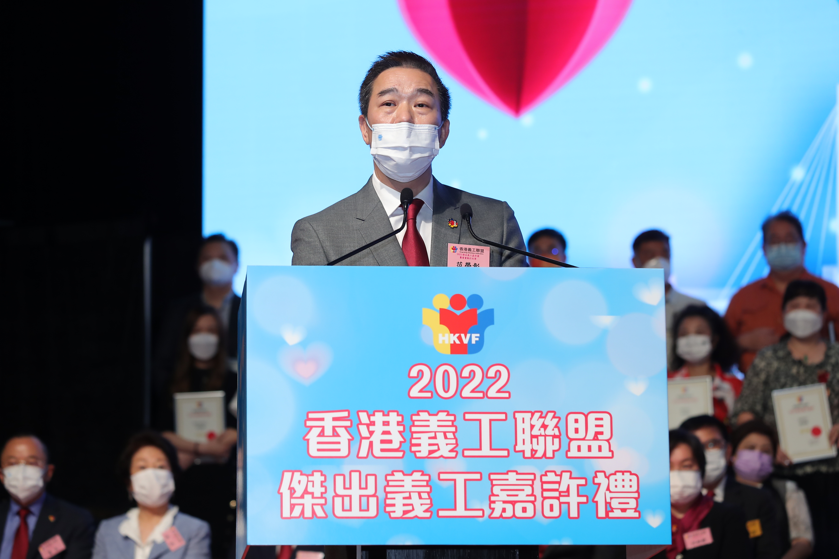嘉许礼筹备委员会执行主席范荣彰在谢辞中提及今年新增奖项“最美抗疫义工奖”,以表扬一班无惧疫情,积极抗疫的义工们。范荣彰表示,疫情爆发时,义工们不求回报,在官民通力合作下,竭尽所能解决市民所需。每一位都是抗疫道路上的英雄,卓越表现照亮香港,为社会弱势社群燃点希望。