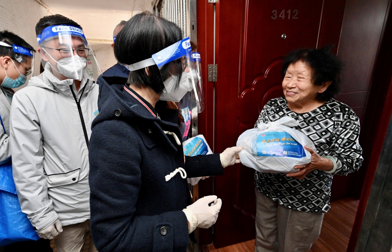 食物及卫生局局长陈肇始今日(3日)到沙田广源邨与义工一起向住户派发“防疫服务包”,希望借此提高市民的防疫意识及加强其防疫能力。