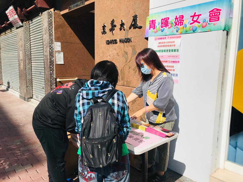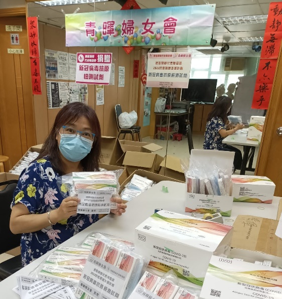 因为我的义工参与和投入,2017年我成为了九龙妇女联会的副主席,也成为了青晖妇女会负责人,在五波疫情期间,幸得港区妇联和九龙妇女联会有抗疫拨款和物资下发,青晖妇女会临危受命,负责将快速检测棒、抗疫物资及时支援会众及基层家庭。当时染疫人数已过百万,香港邮政和顺丰速递公司相继取消包裹送递服务,为了让确诊者、会员和基层市民得到抗疫物资,青晖妇女会在3月上、中旬包装抗疫包,犯险在会所楼下摆设街站,让会员、街坊和有需要的市民取得物资。结果我于3月16日首先确诊染疫,连带爸妈一家四口全部中招!